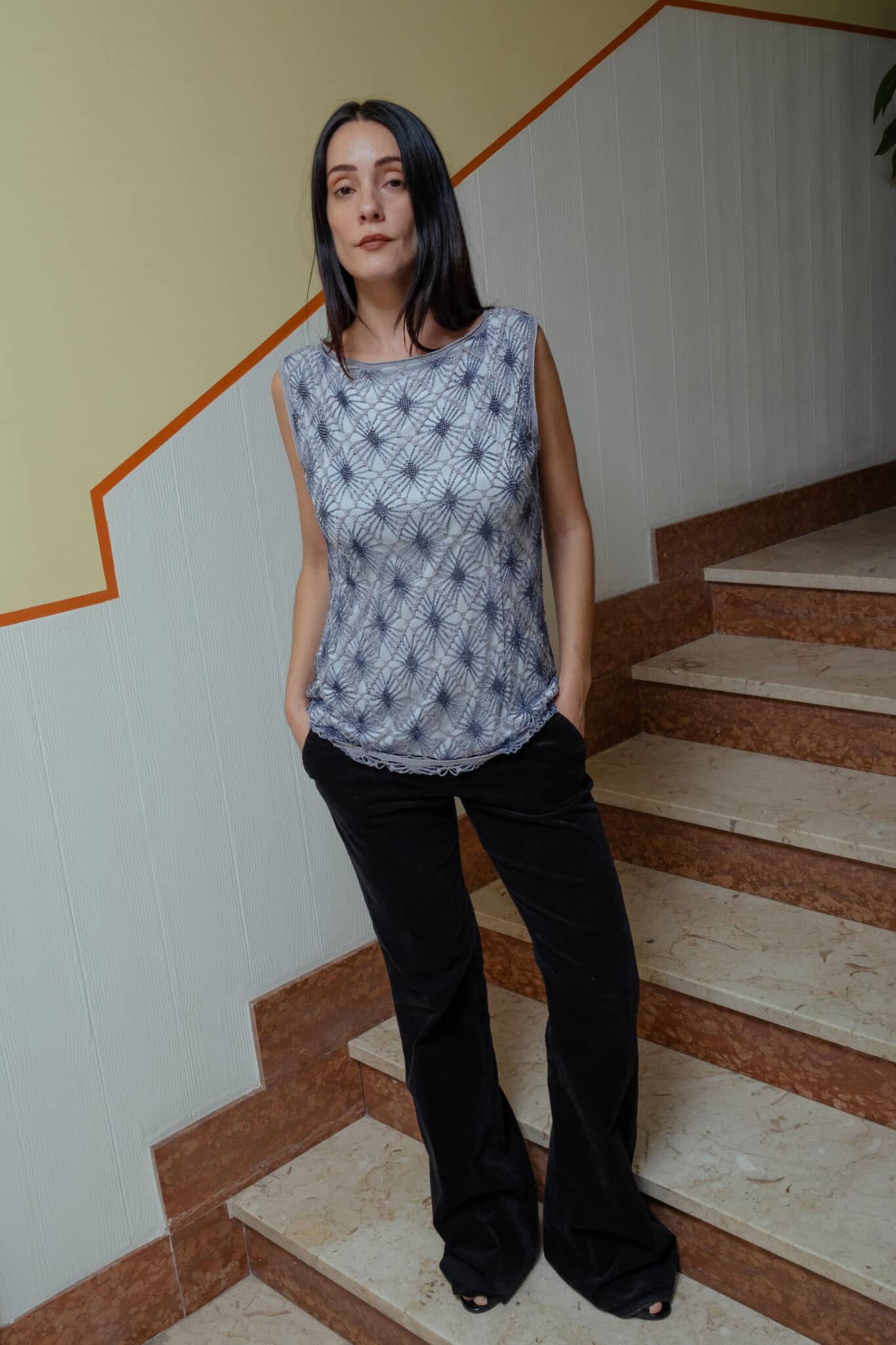 Full outfit featuring sheer black top, black textured skirt, and polka dot scarf detail.