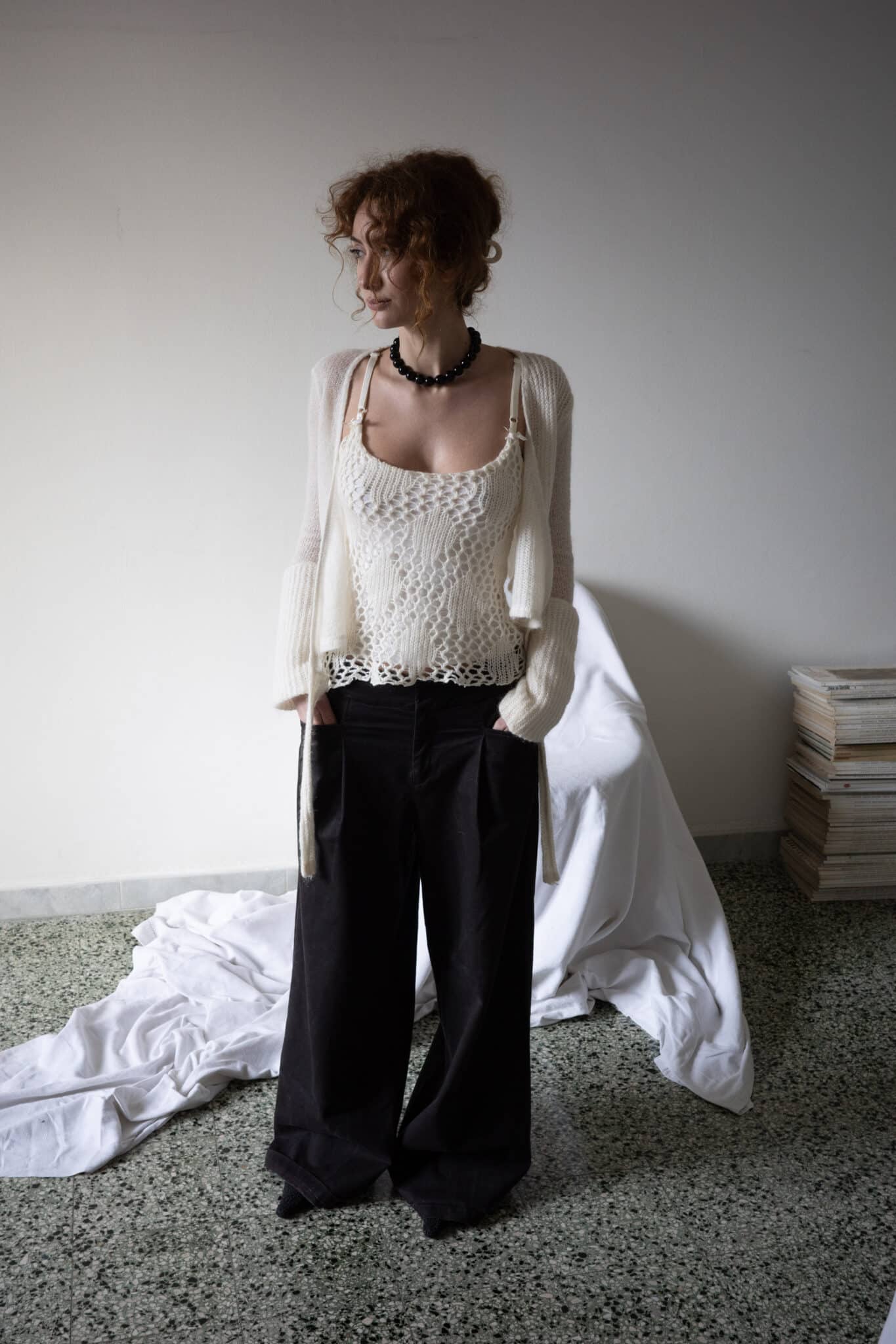 openwork knitted camisole top in off-white