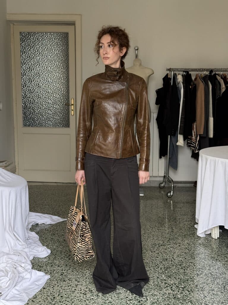 Black leather jacket with structured fit and clean front closure