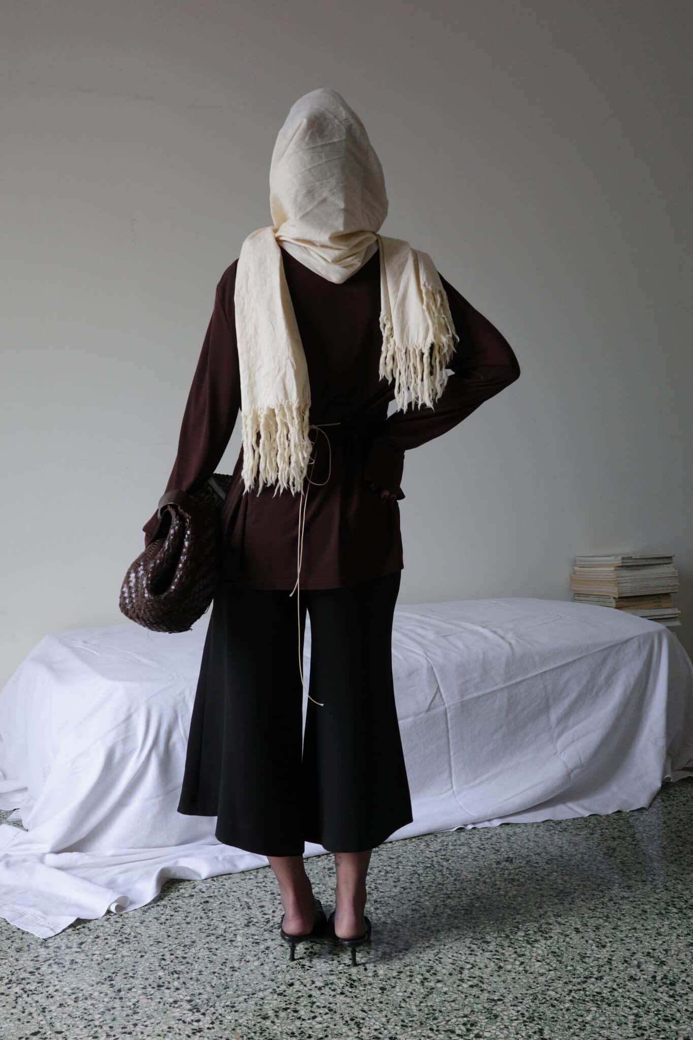 Brown knit sweater with off-shoulder neckline and wrap-style waist tie
