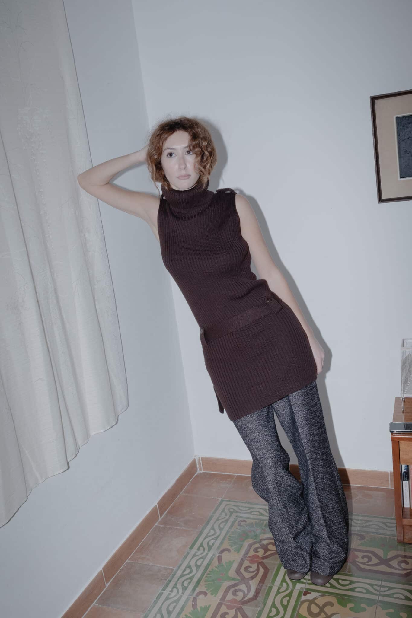 Purple wool knit with two-way zip worn with elongated flare trousers.