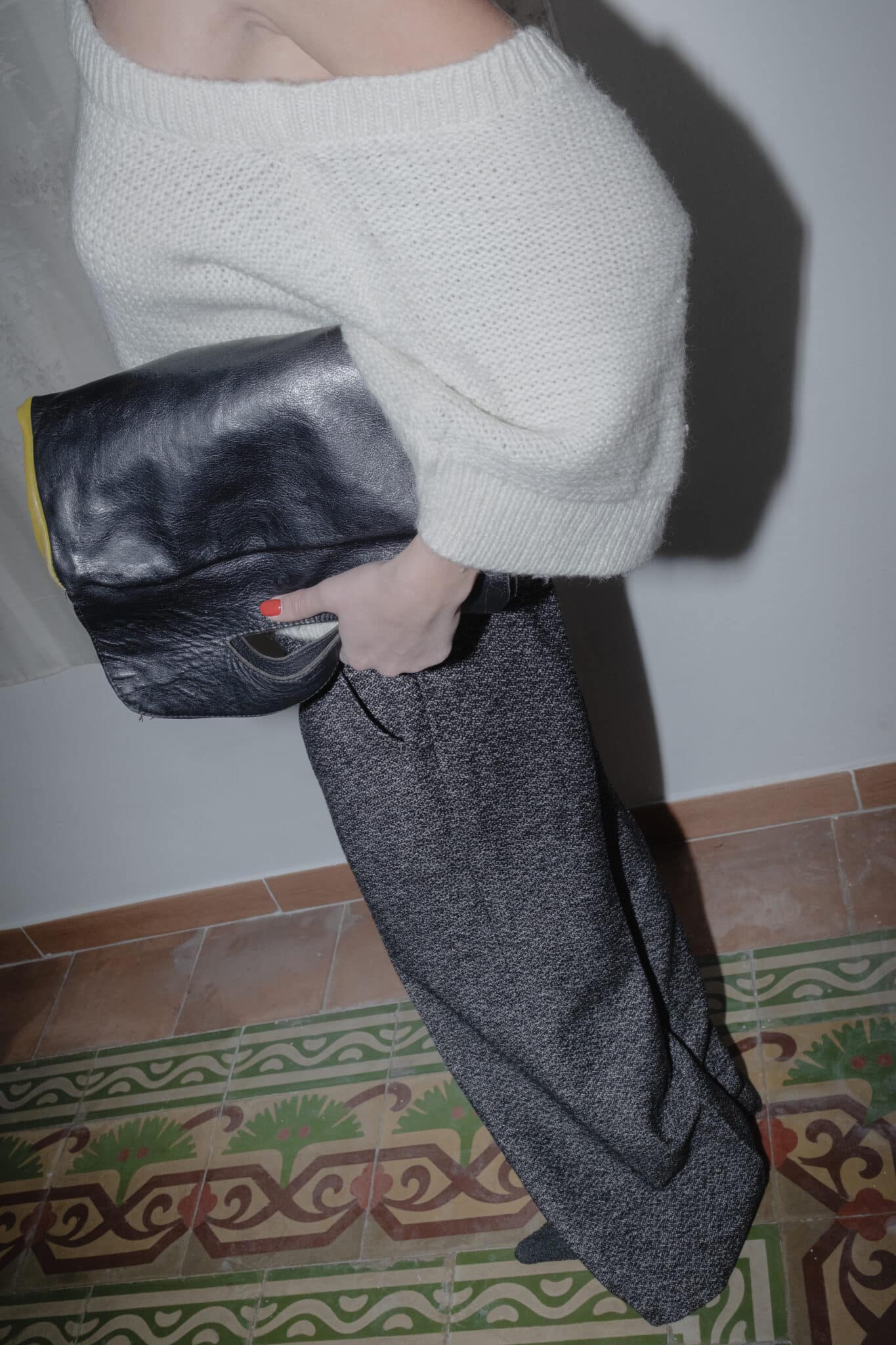 Deep-toned oversized wool sweater styled over a flowing silky skirt.