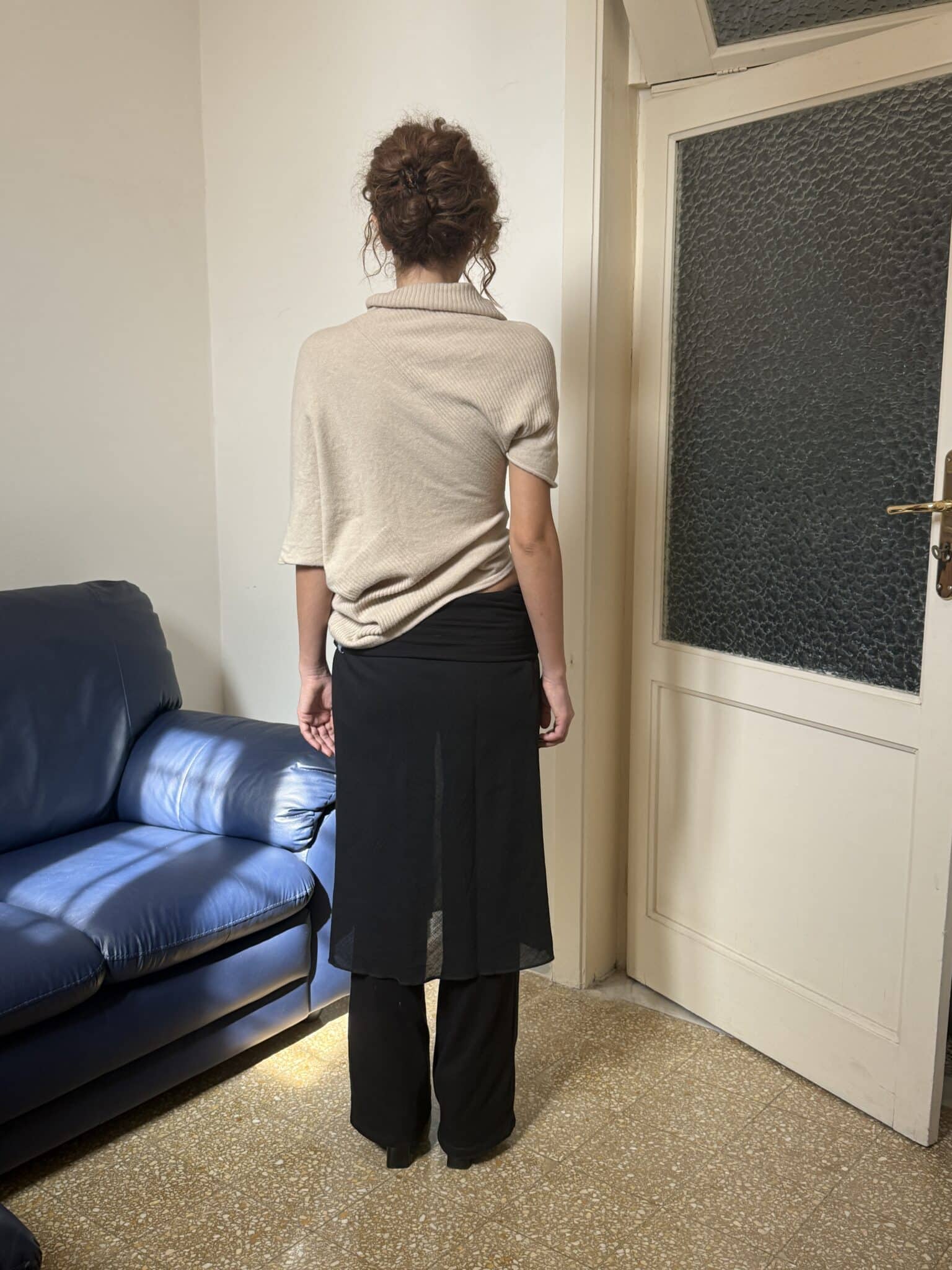 asymmetric draped top in 100% wool – Warm beige fine wool top featuring an asymmetric draped construction that creates soft diagonal lines across the body.