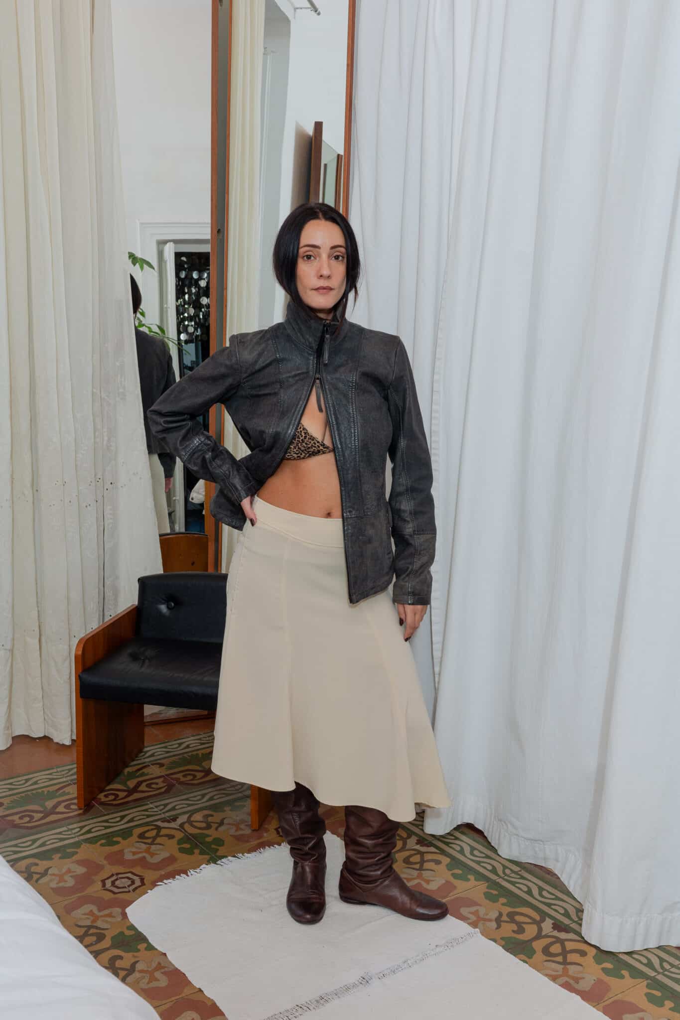 asymmetric midi skirt – beige midi skirt in lightweight woven fabric with a gentle drape and wide waistband. designed with a subtle corset-inspired function that allows the waist to be tightened for shape