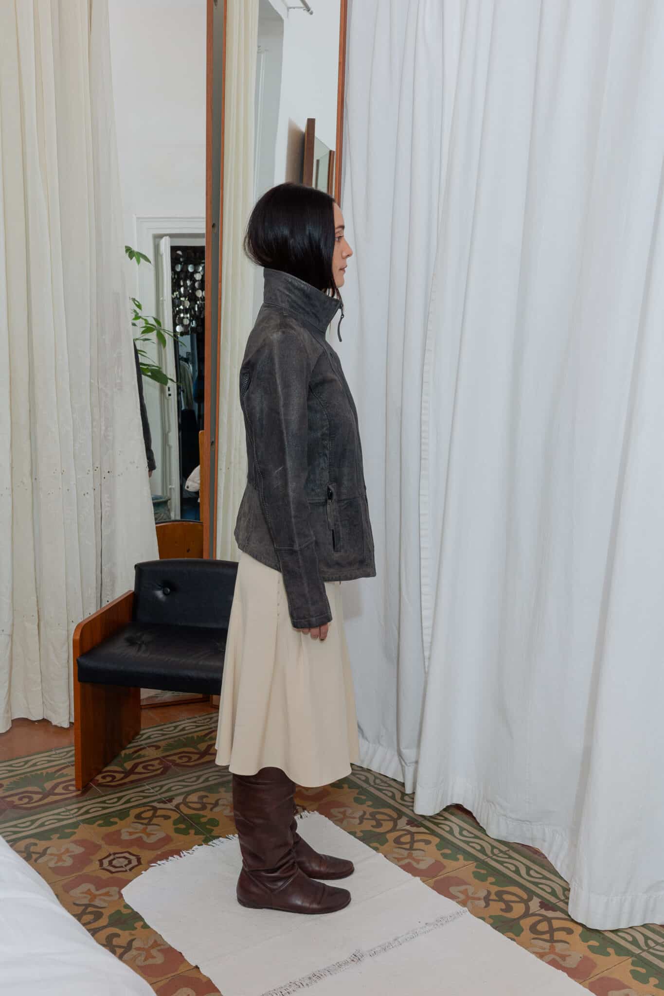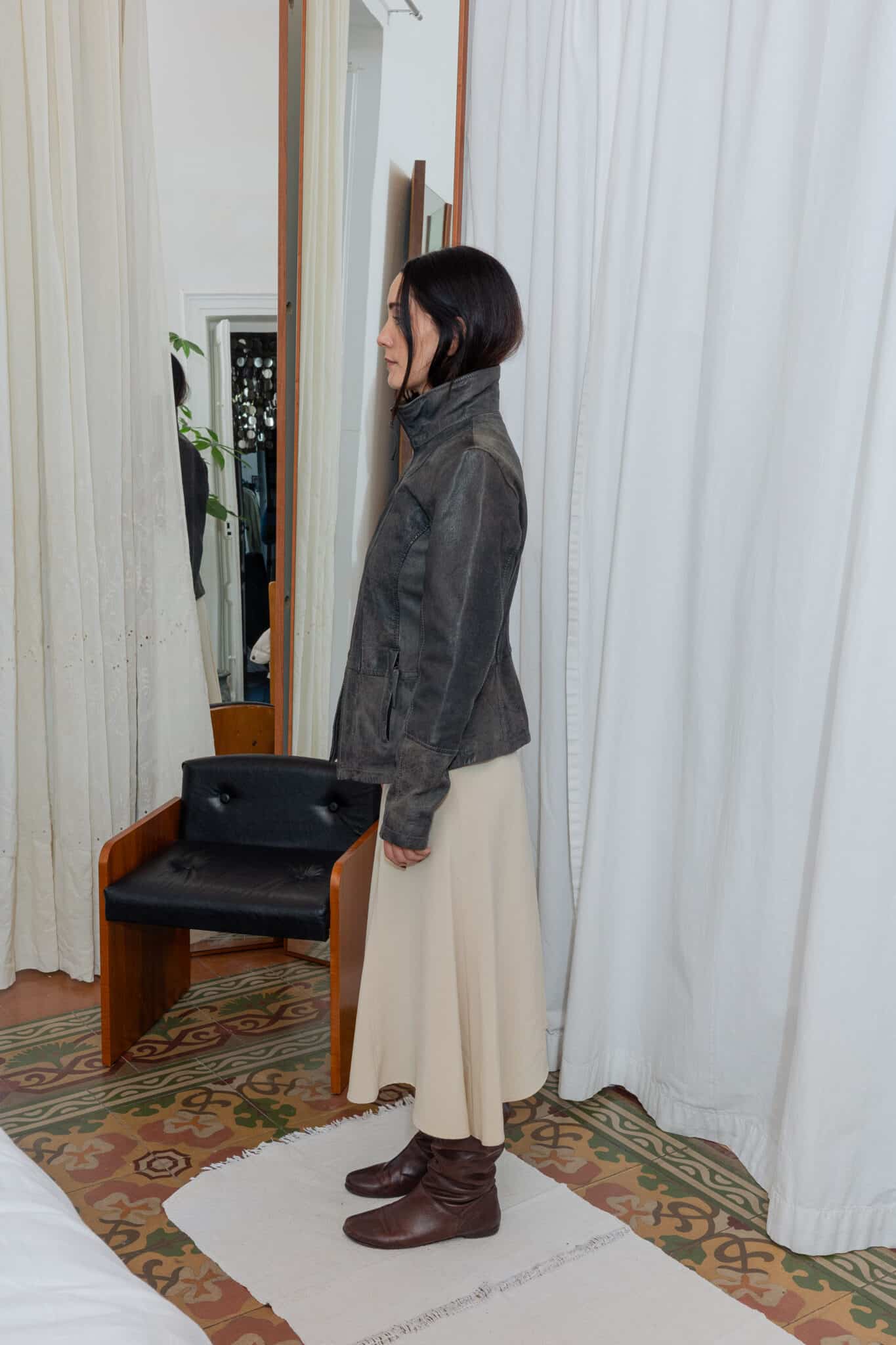 asymmetric midi skirt – beige midi skirt in lightweight woven fabric with a gentle drape and wide waistband. designed with a subtle corset-inspired function that allows the waist to be tightened for shape