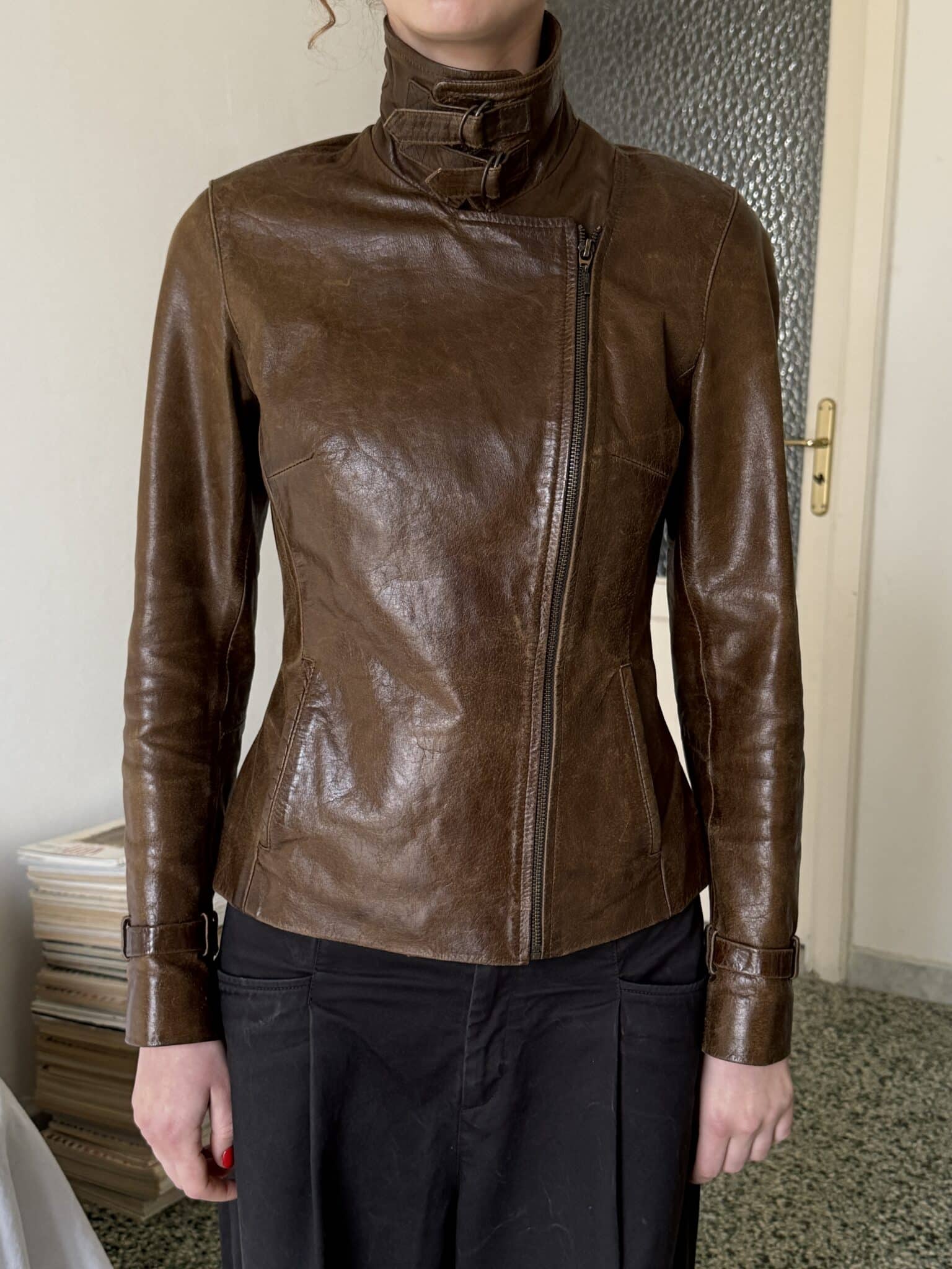 Brown leather jacket with an asymmetric front zip, high stand collar featuring buckle fastening, long sleeves with adjustable cuff straps, and front seam detailing that follows the body. side pockets and a smooth leather surface showing natural texture and patina.