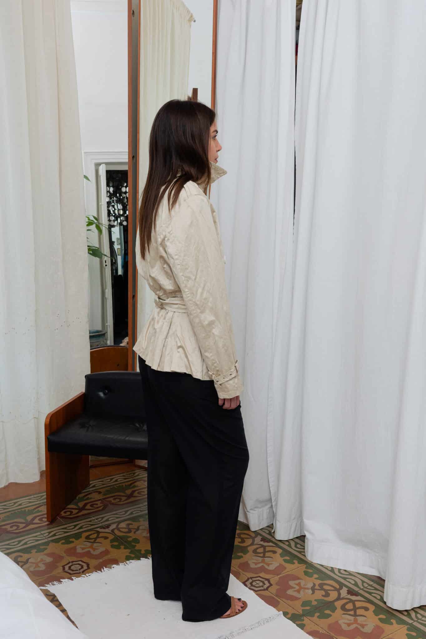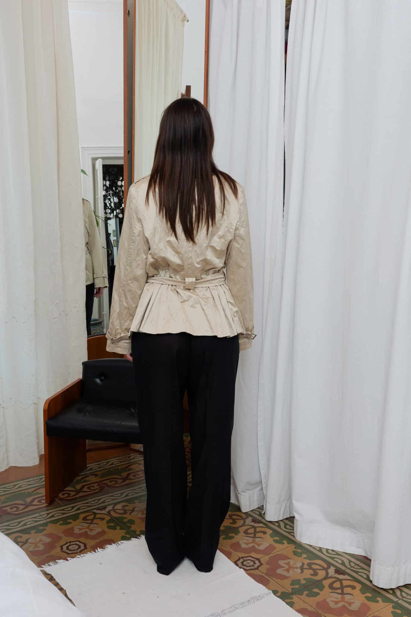 Beige cropped trench jacket – lightweight belted in soft beige. Features structured shoulders, front button closure, and adjustable waist belt.