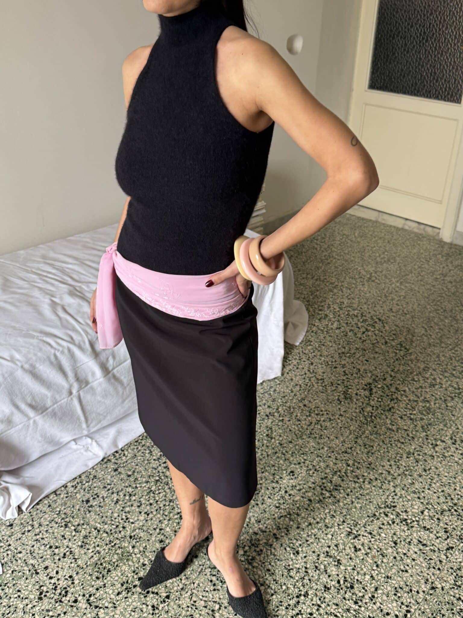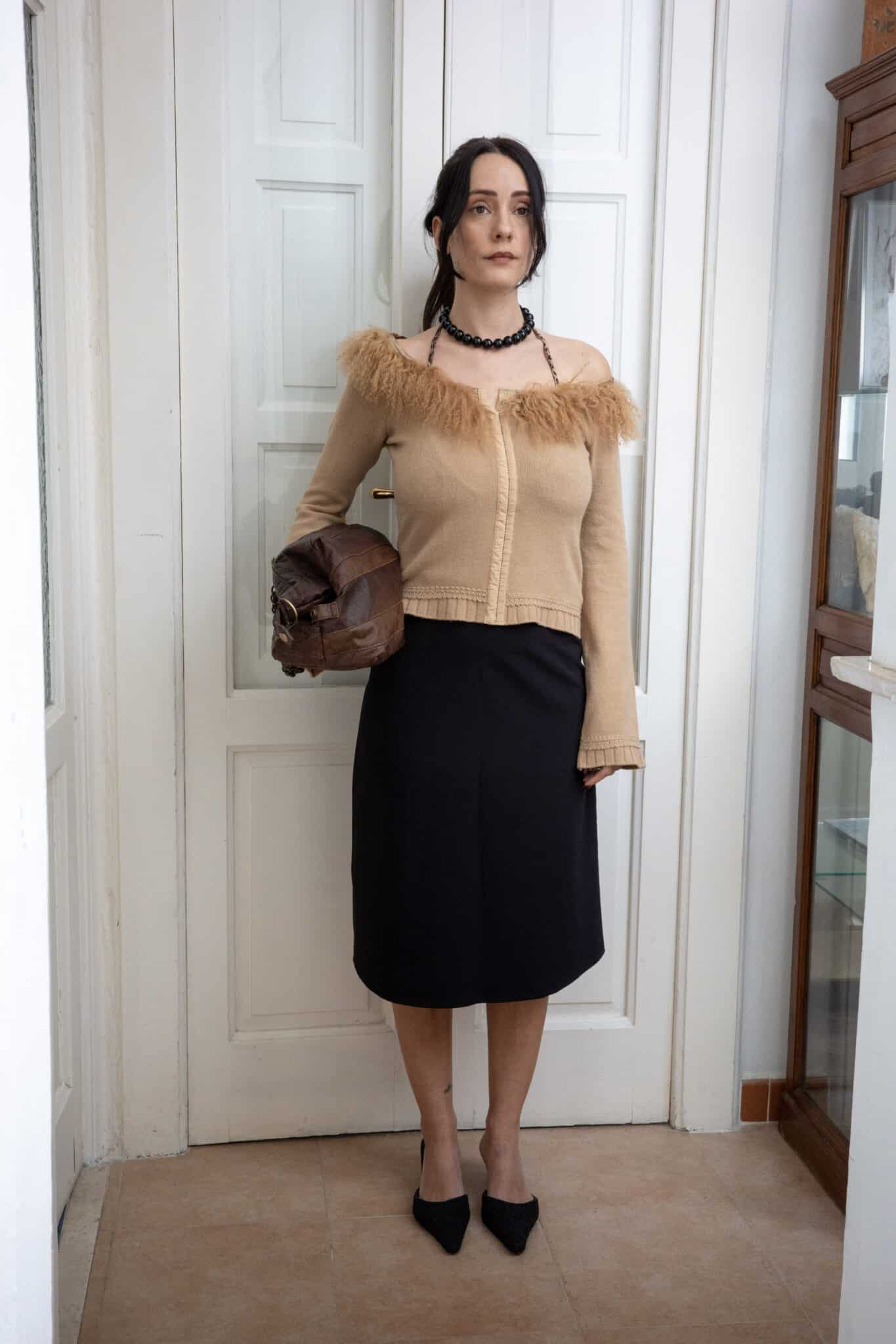 Black midi skirt with a clean, straight silhouette and a minimal, refined construction. Designed to sit smoothly at the waist and fall naturally along the body