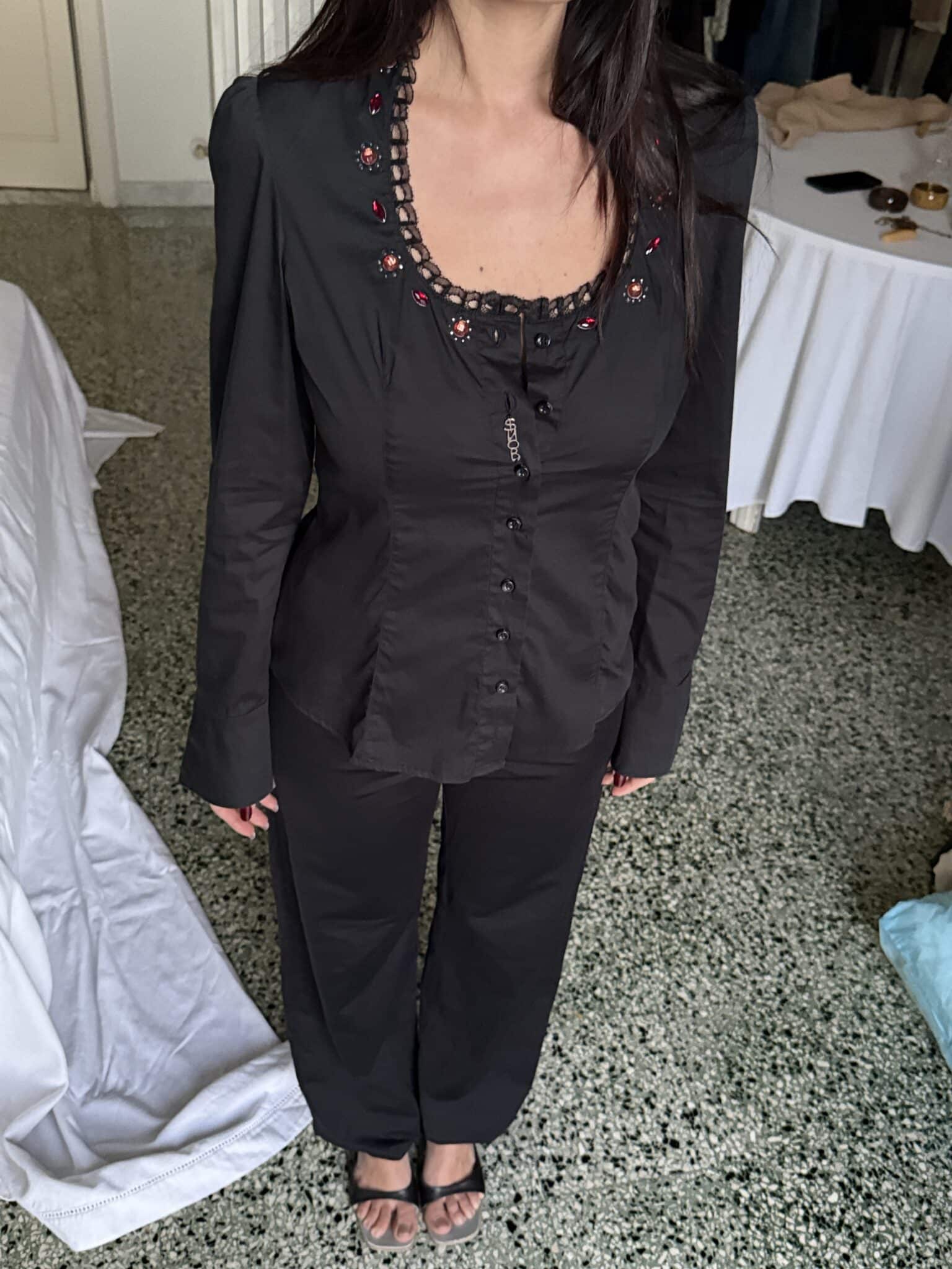 black fitted button-up shirt with a tailored silhouette, lace-trimmed neckline, and decorative bead details. Long sleeves and a close fit through the waist