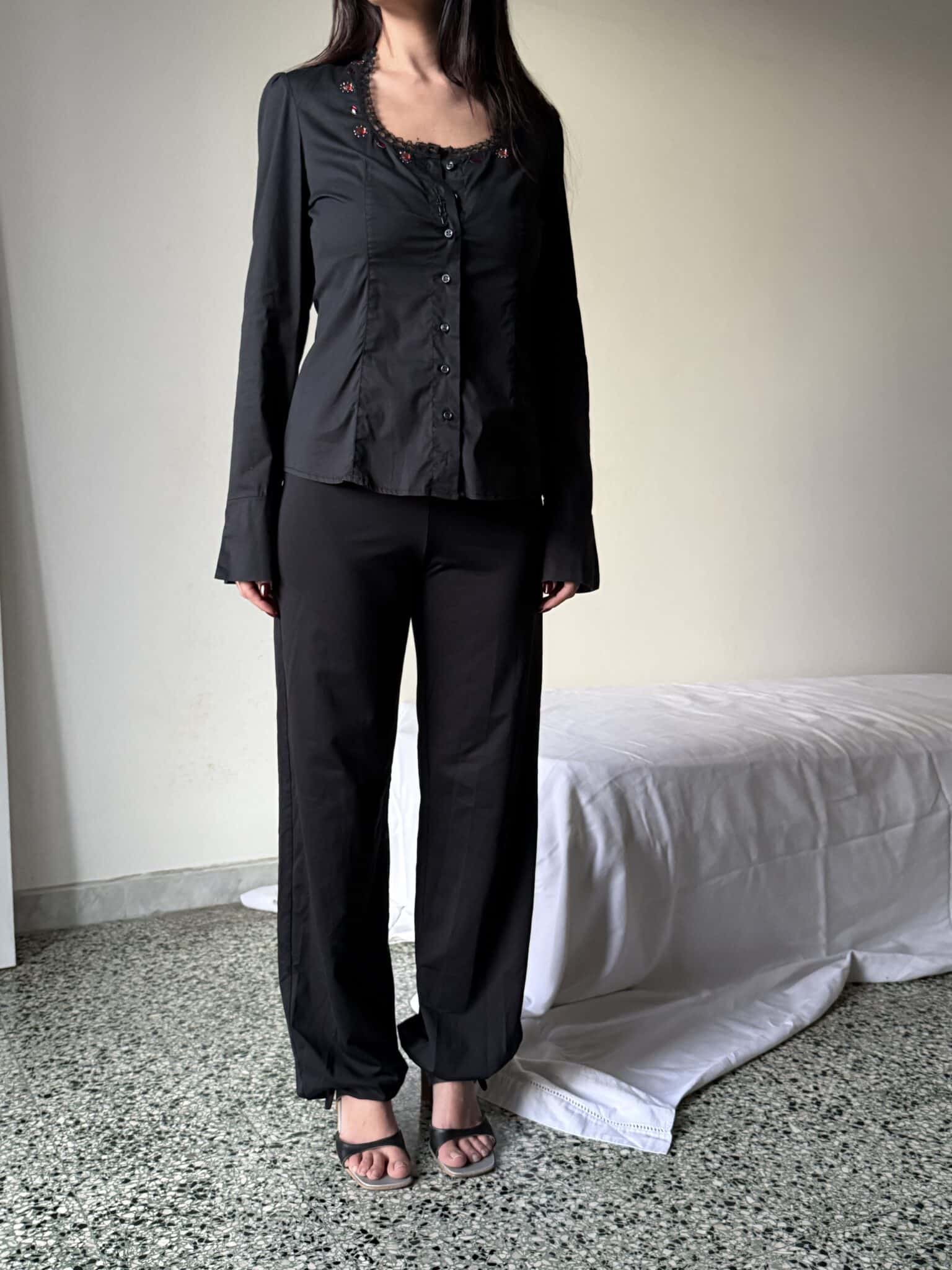 black fitted button-up shirt with a tailored silhouette, lace-trimmed neckline, and decorative bead details. Long sleeves and a close fit through the waist