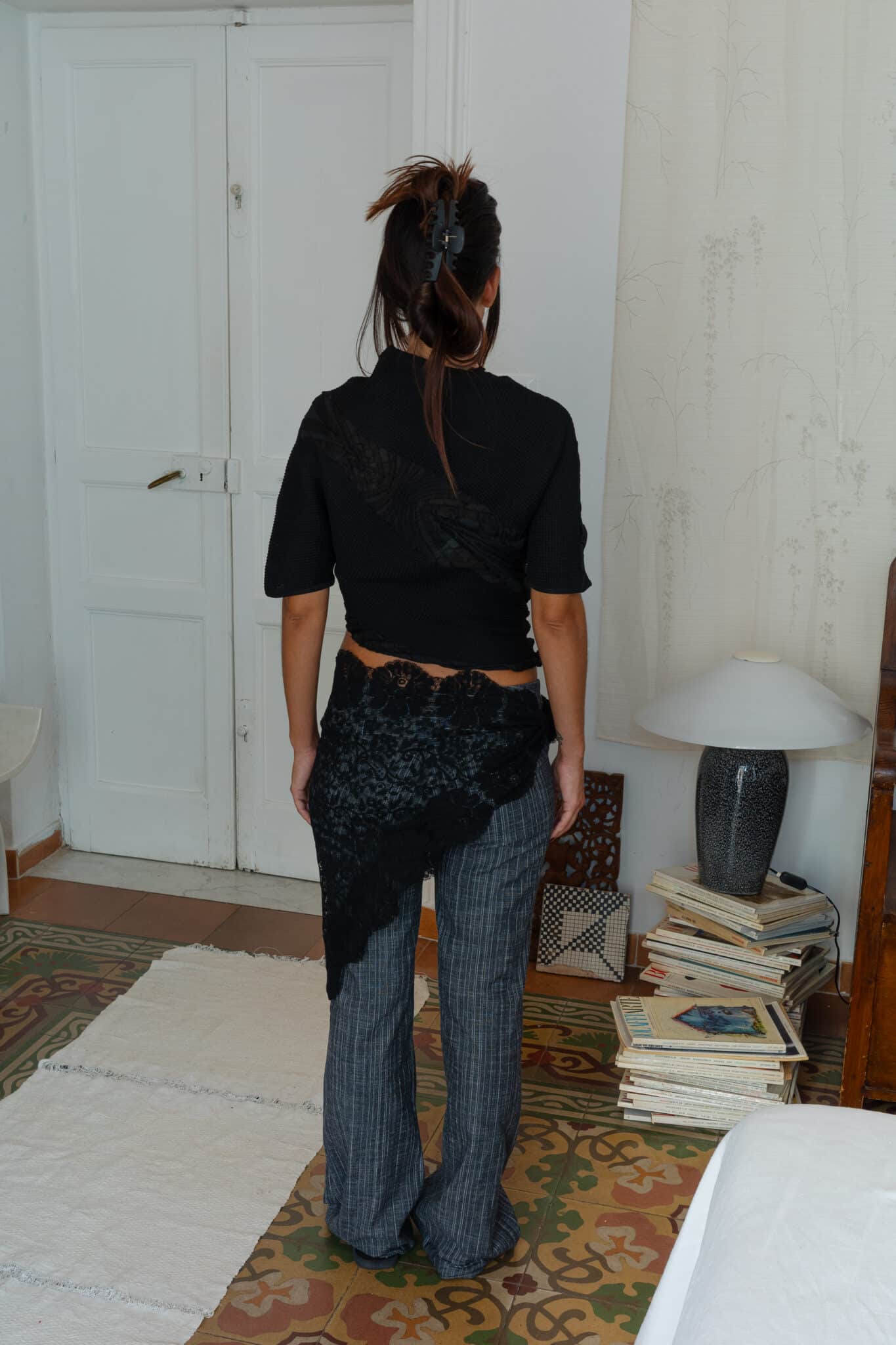 Black Floral Lace Scarf – triangular lace scarf with intricate floral embroidery and scalloped edges. Lightweight and elegant layering piece.