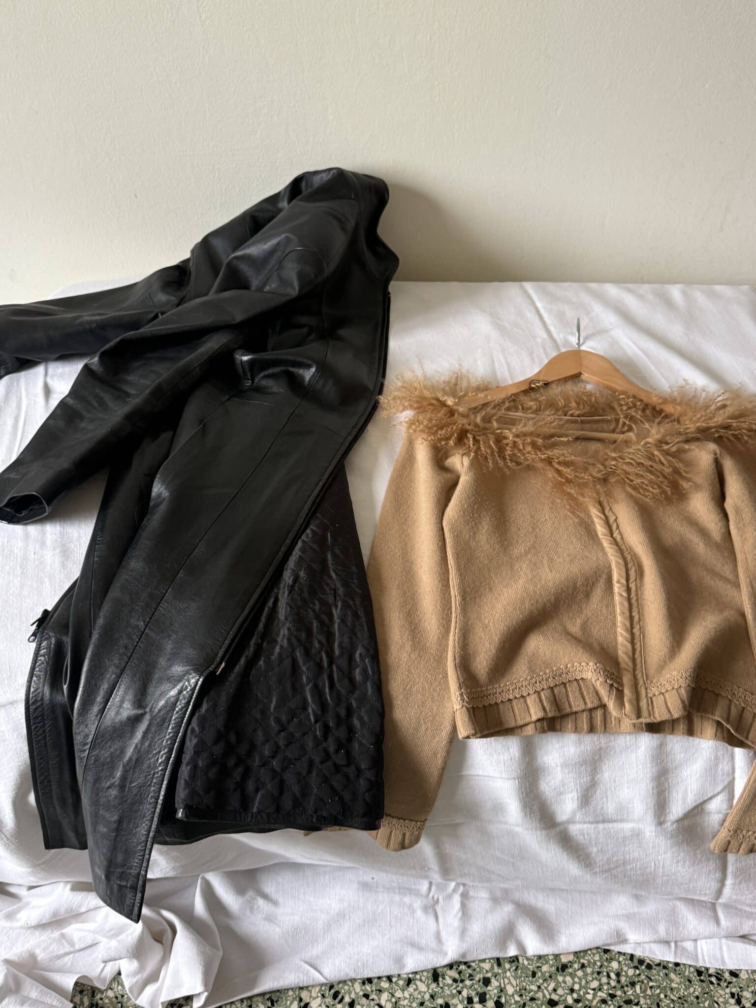 black leather jacket – structured black leather jacket with a clean front zip closure, defined seams and a smooth surface with natural structure