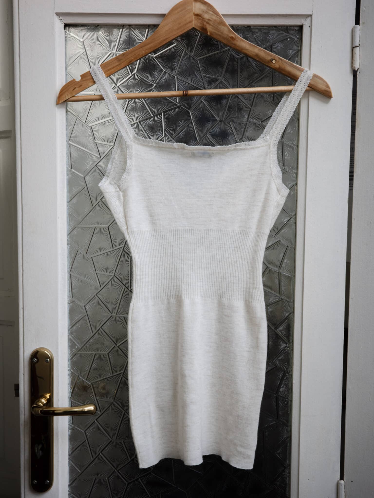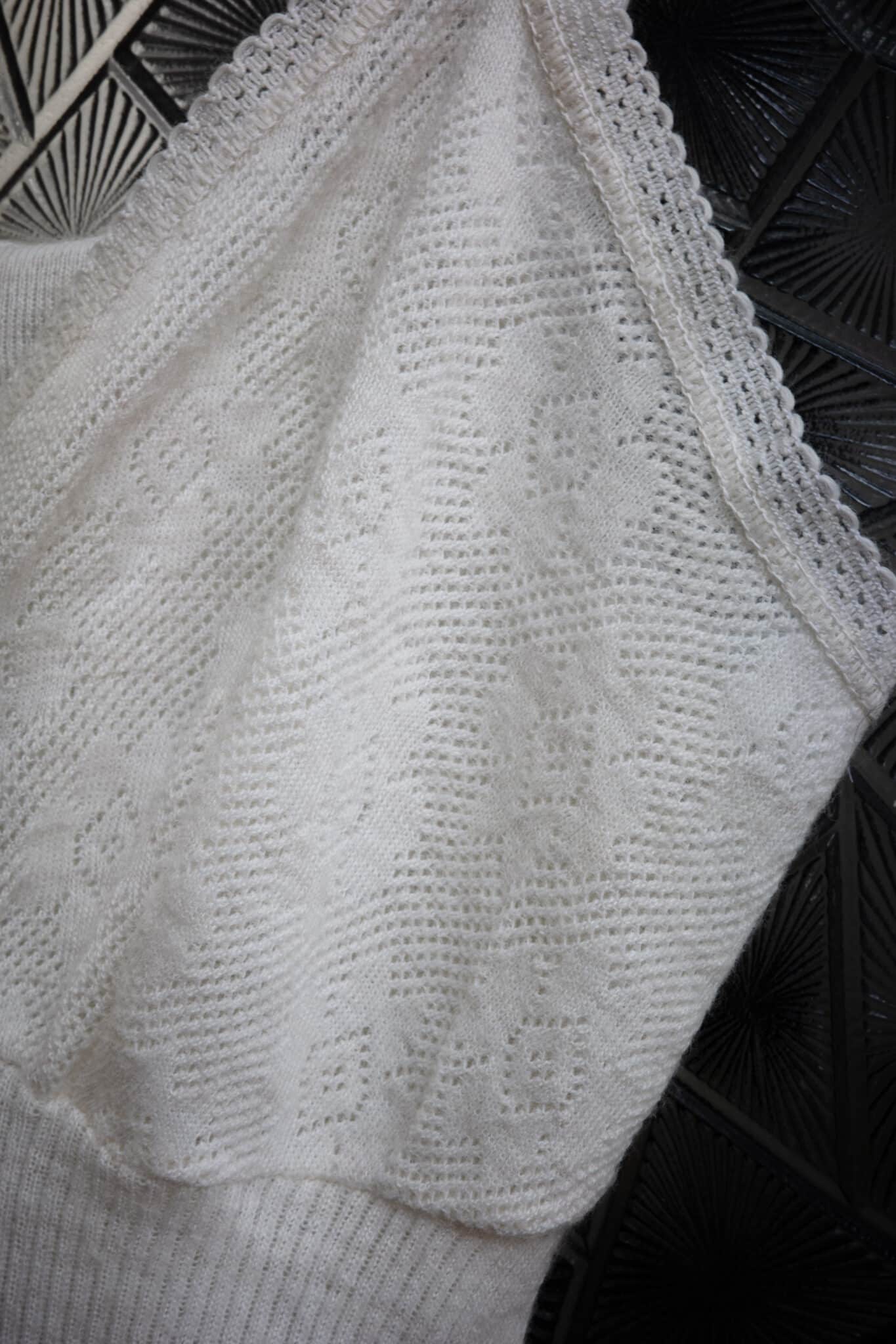 Fitted knit camisole with a defined ribbed waist and soft lace-knit cups. Wide shoulder straps and lace trim along the neckline and straps.