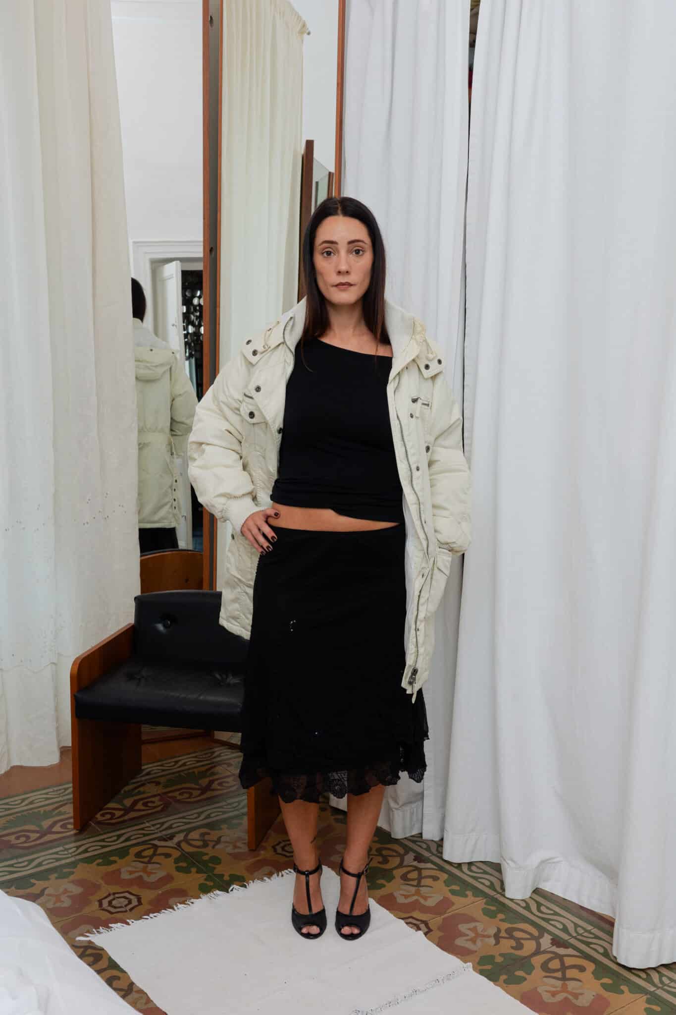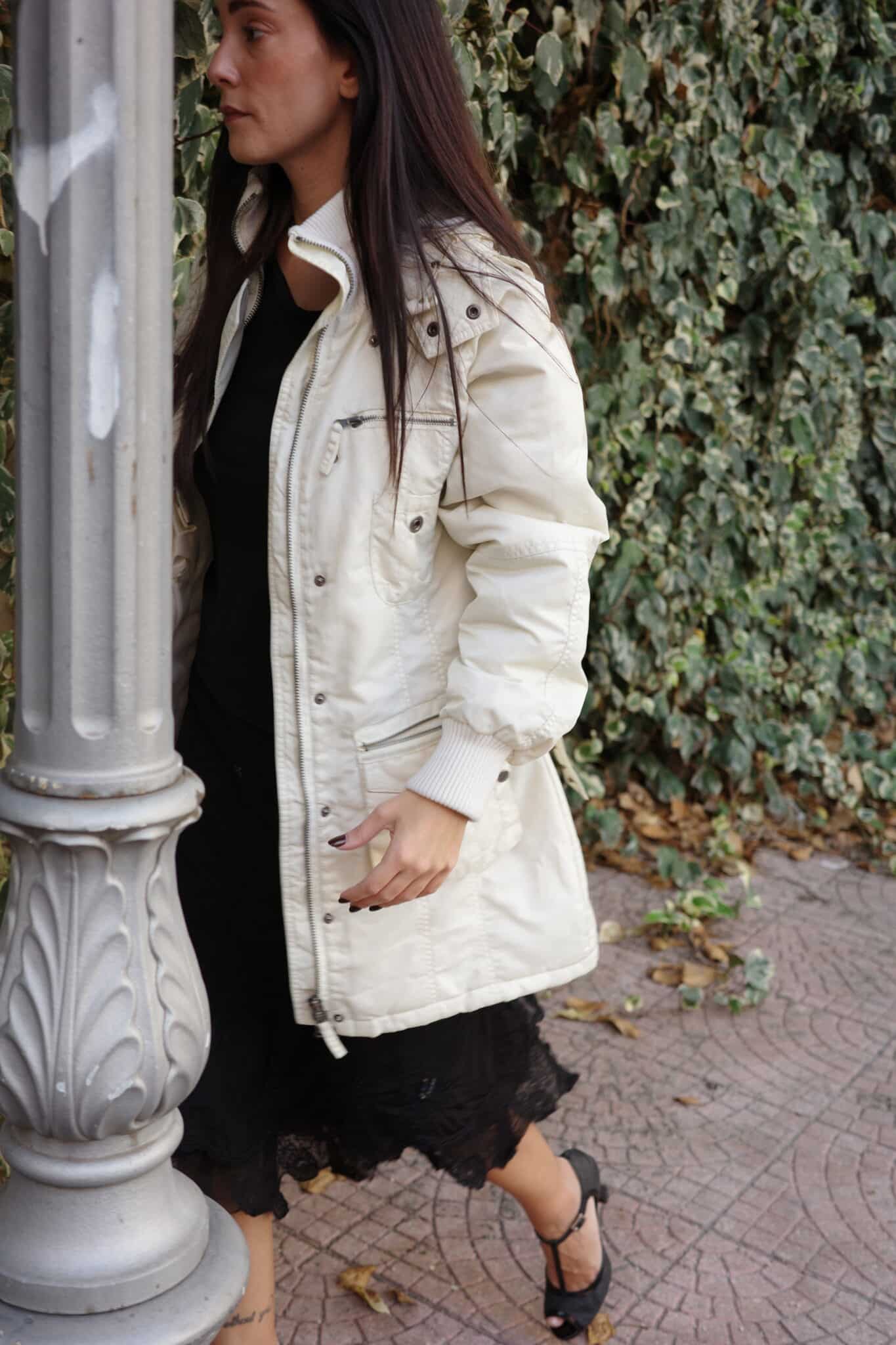 cream padded parka jacket with high collar, zip closure, and insulated lining. designed with drawstring waist and multiple pockets for a structured fit.