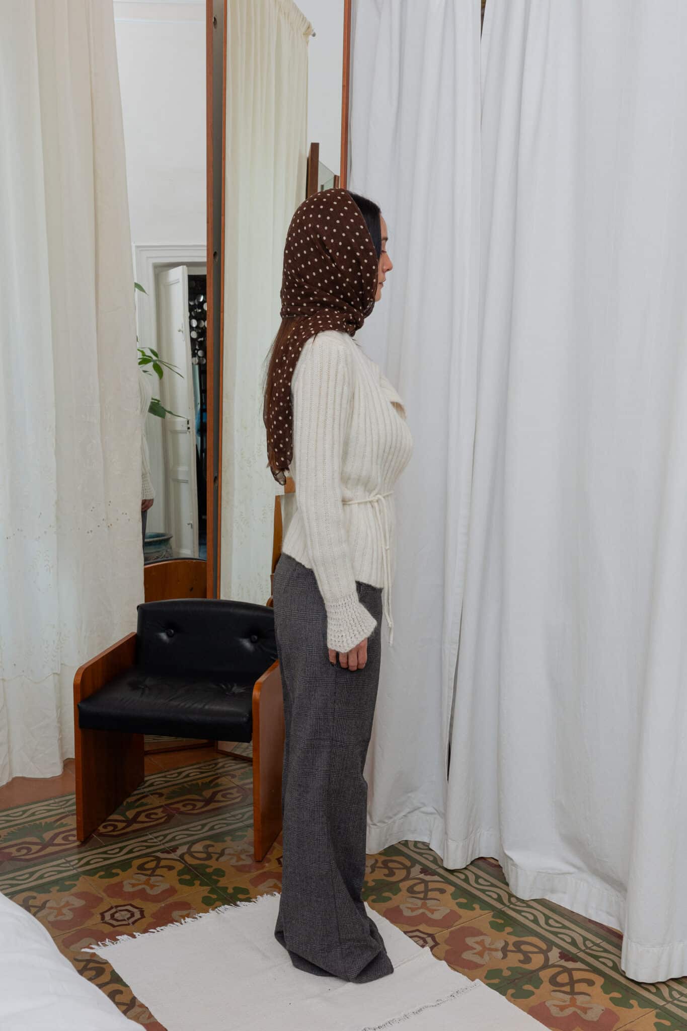 cream ribbed tie cardigan – soft knit cardigan with front tie closure and structured ribbed texture. designed with wide sleeves and open neckline.