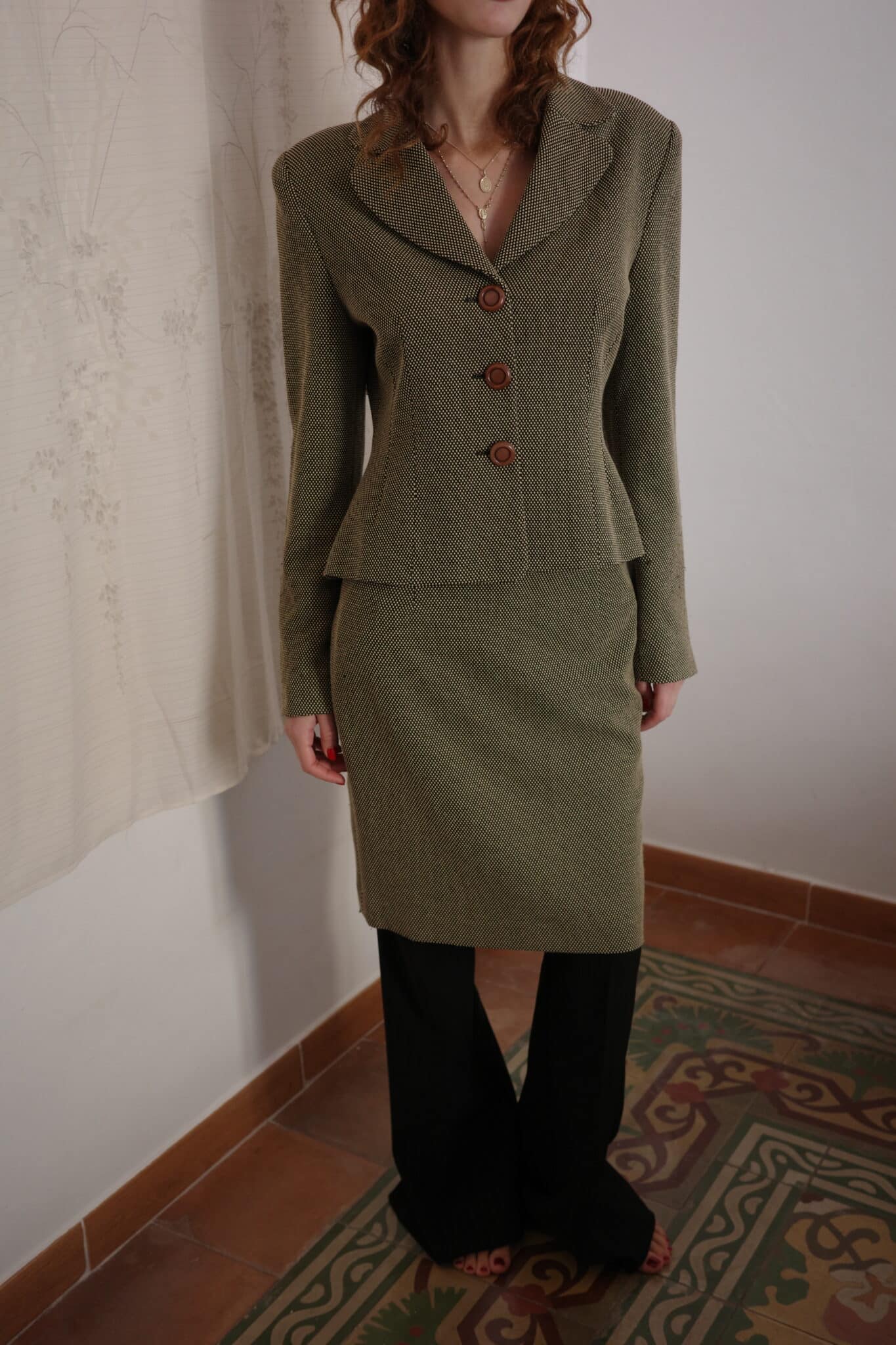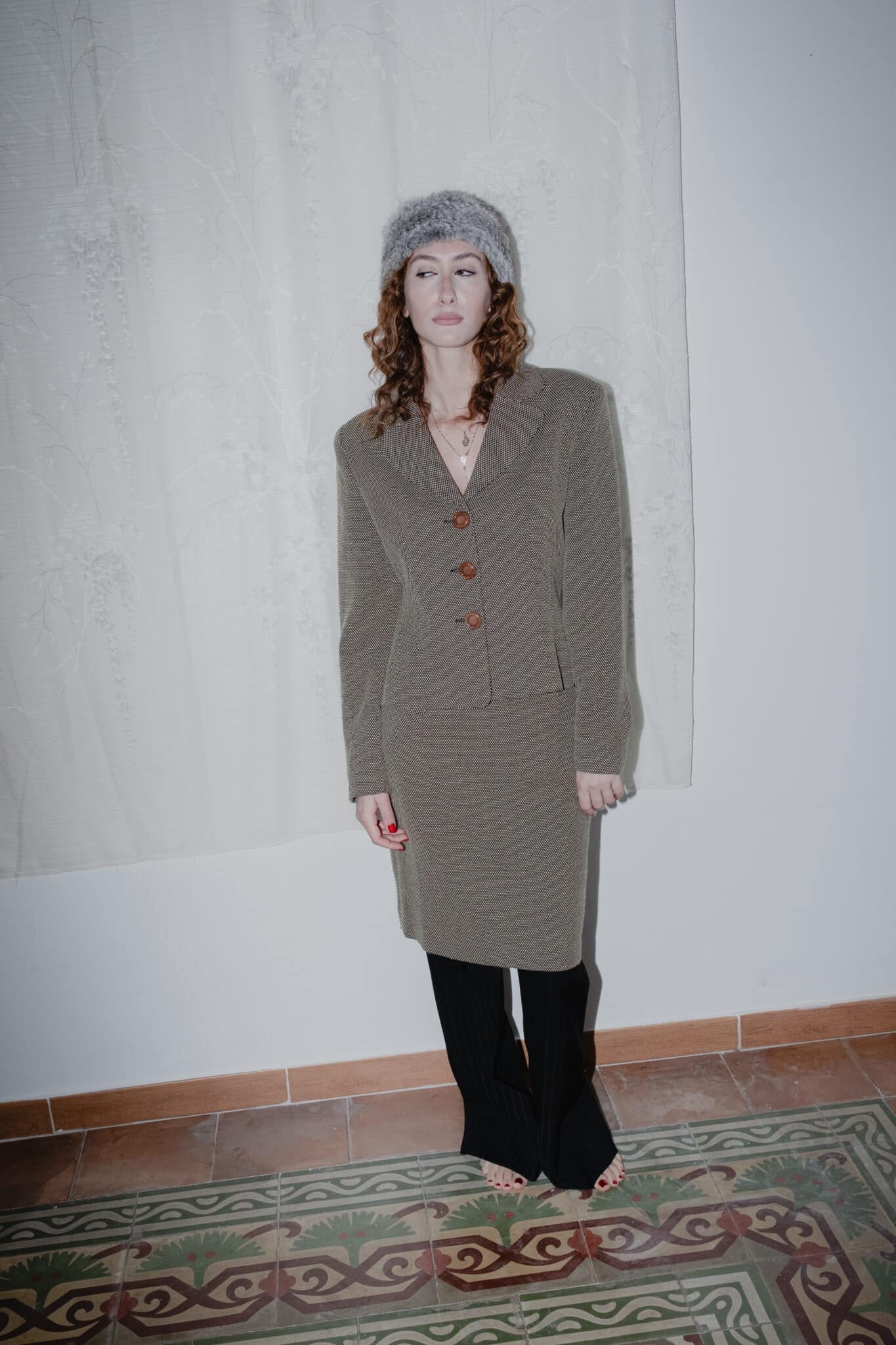 Tailored blazer in a structured silhouette with a defined waist, notched lapels, curved seams and brown button closure.