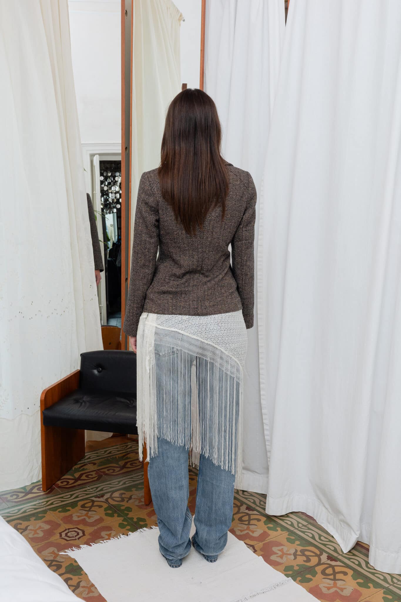 Fitted wool blazer detailed with curved seams, leather-trimmed edges, and leather buttons.