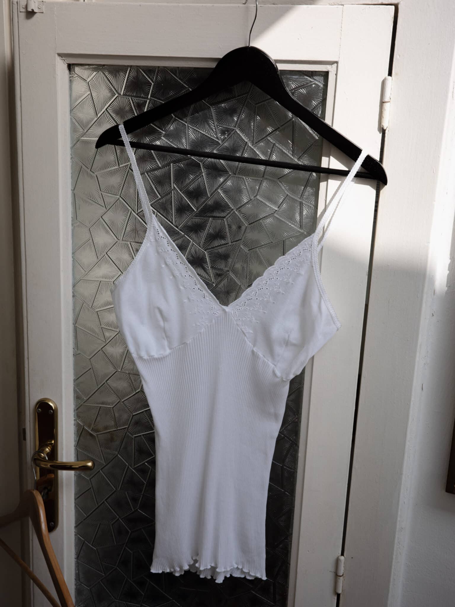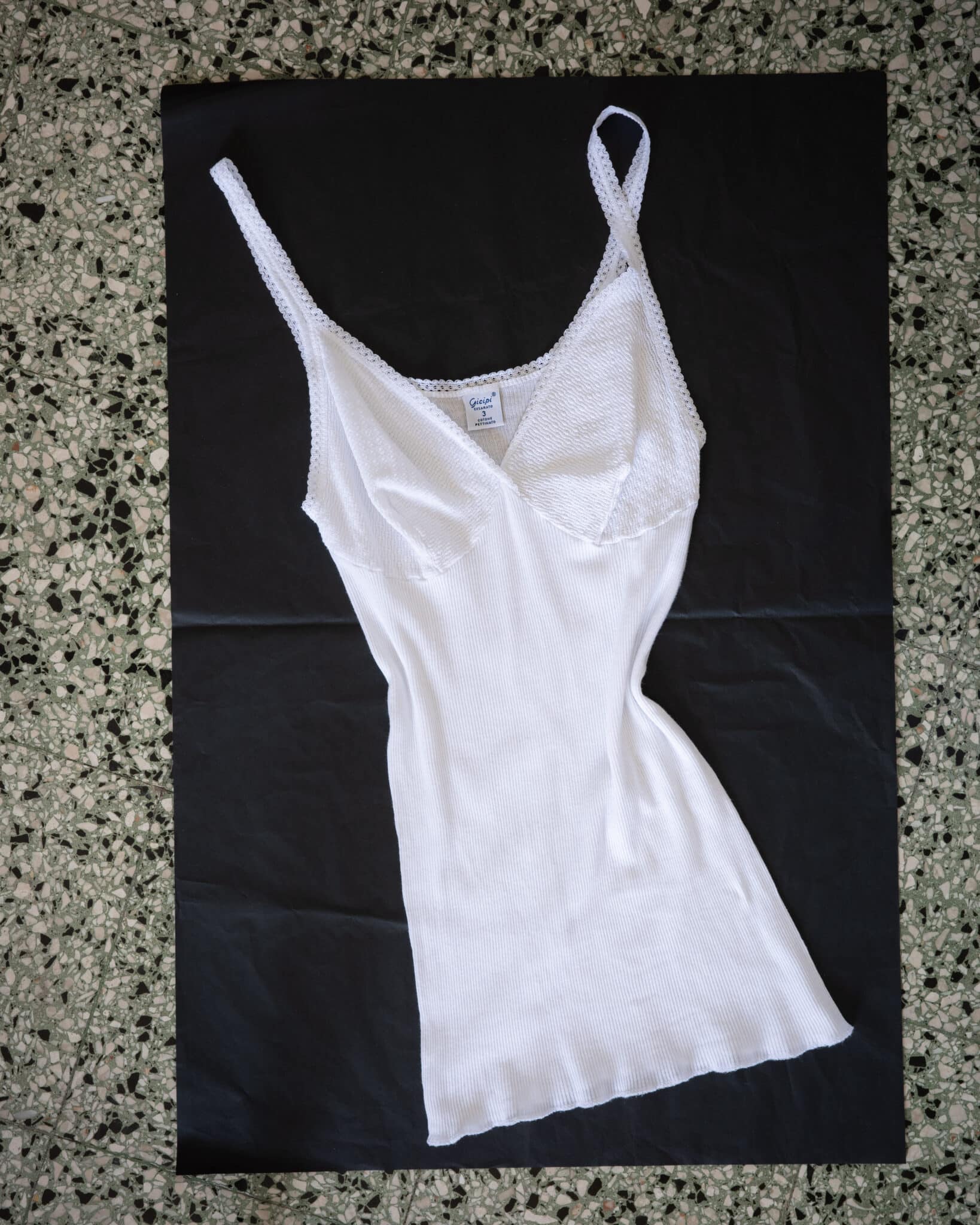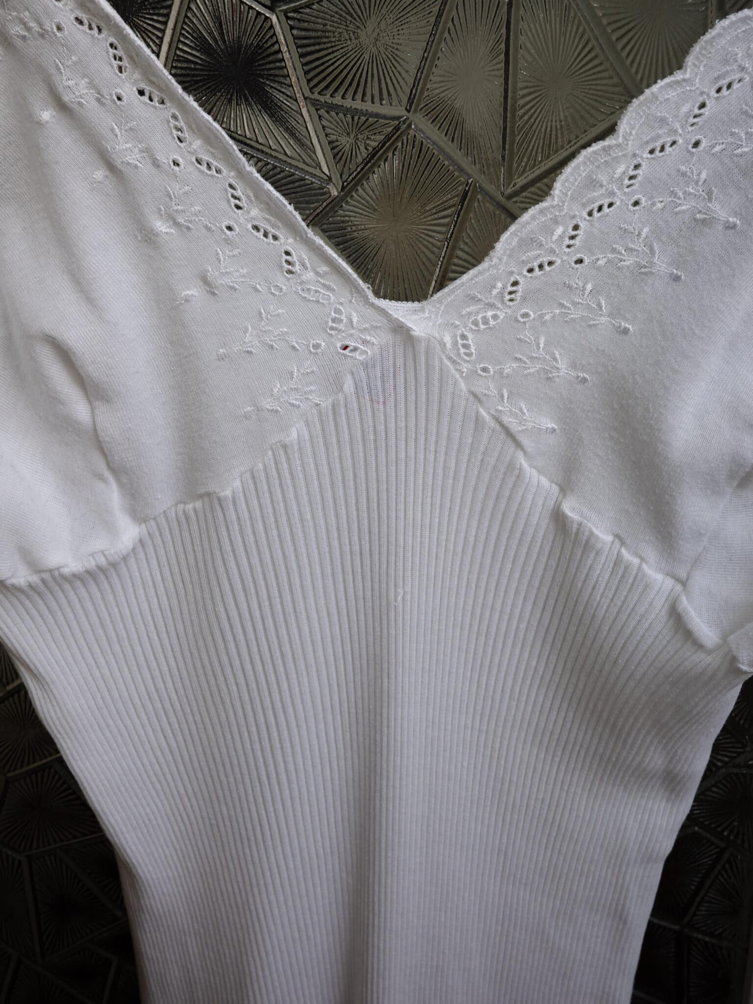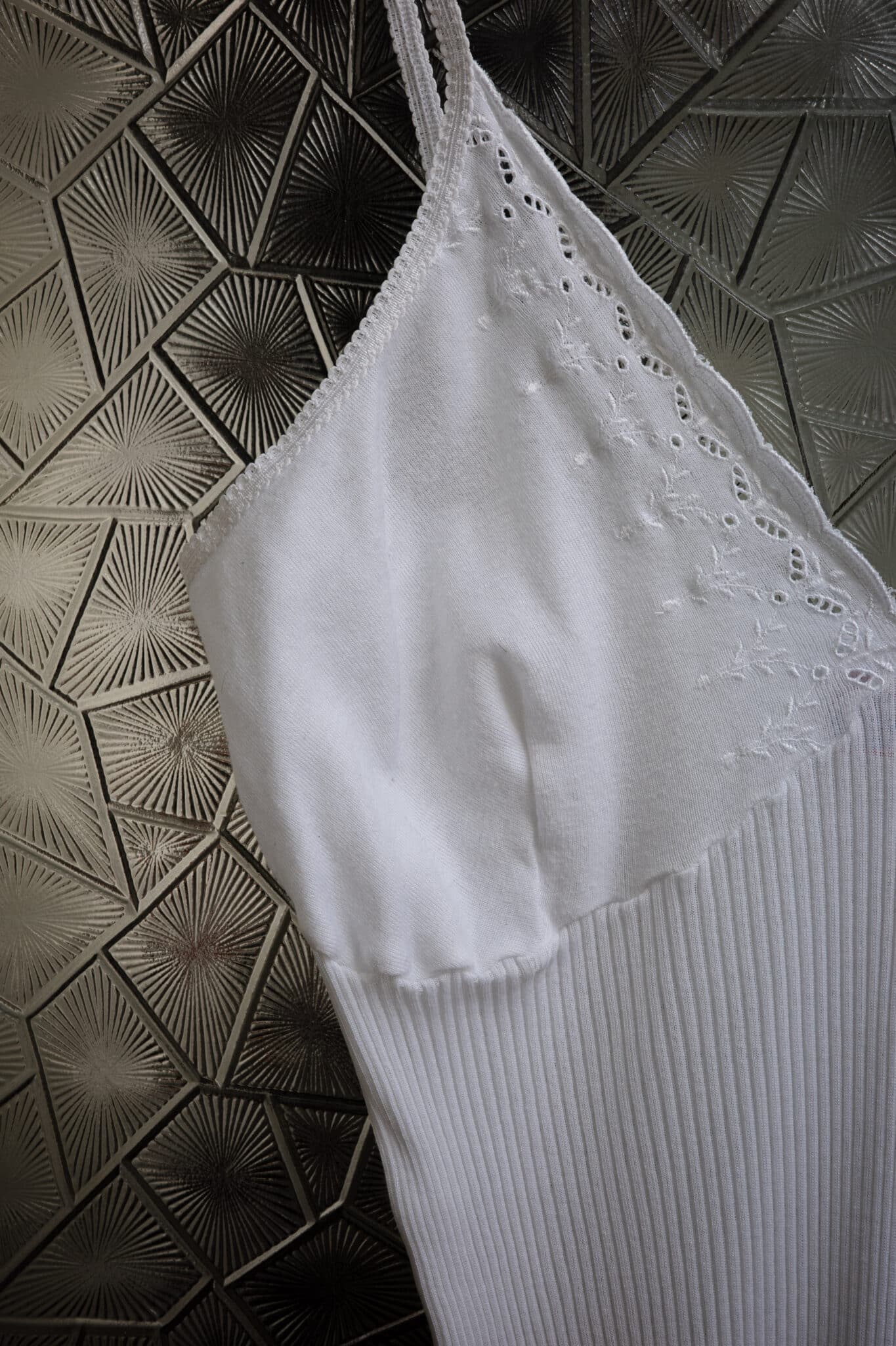 Embroidered lace cup ribbed camisole with V-neckline, thin straps and a fitted ribbed body. Soft stretch knit with scalloped hem.