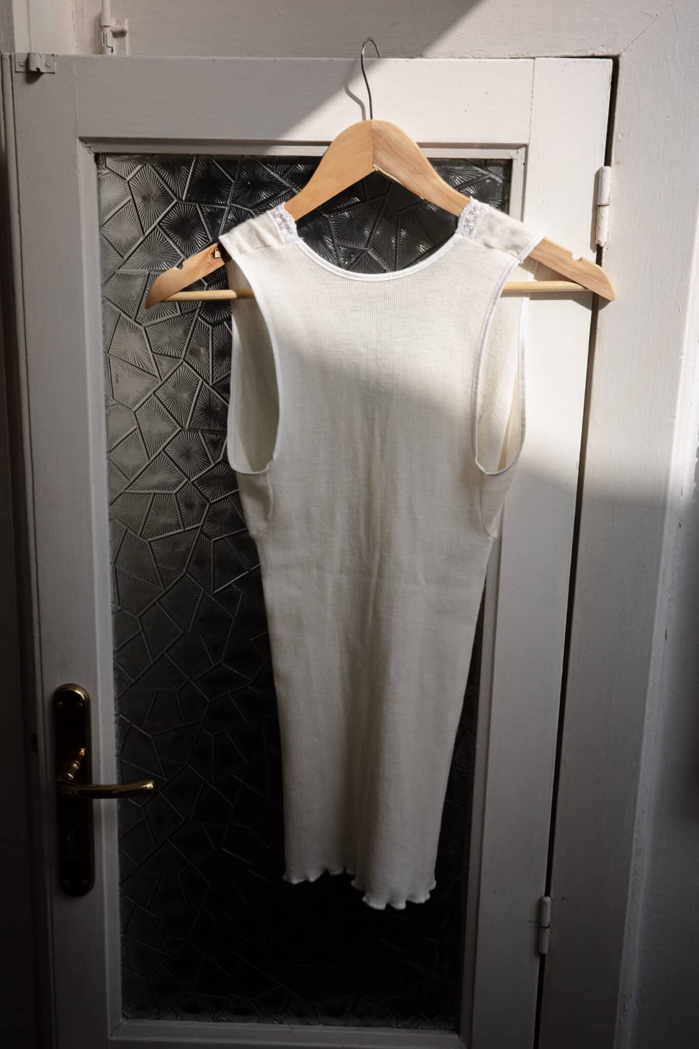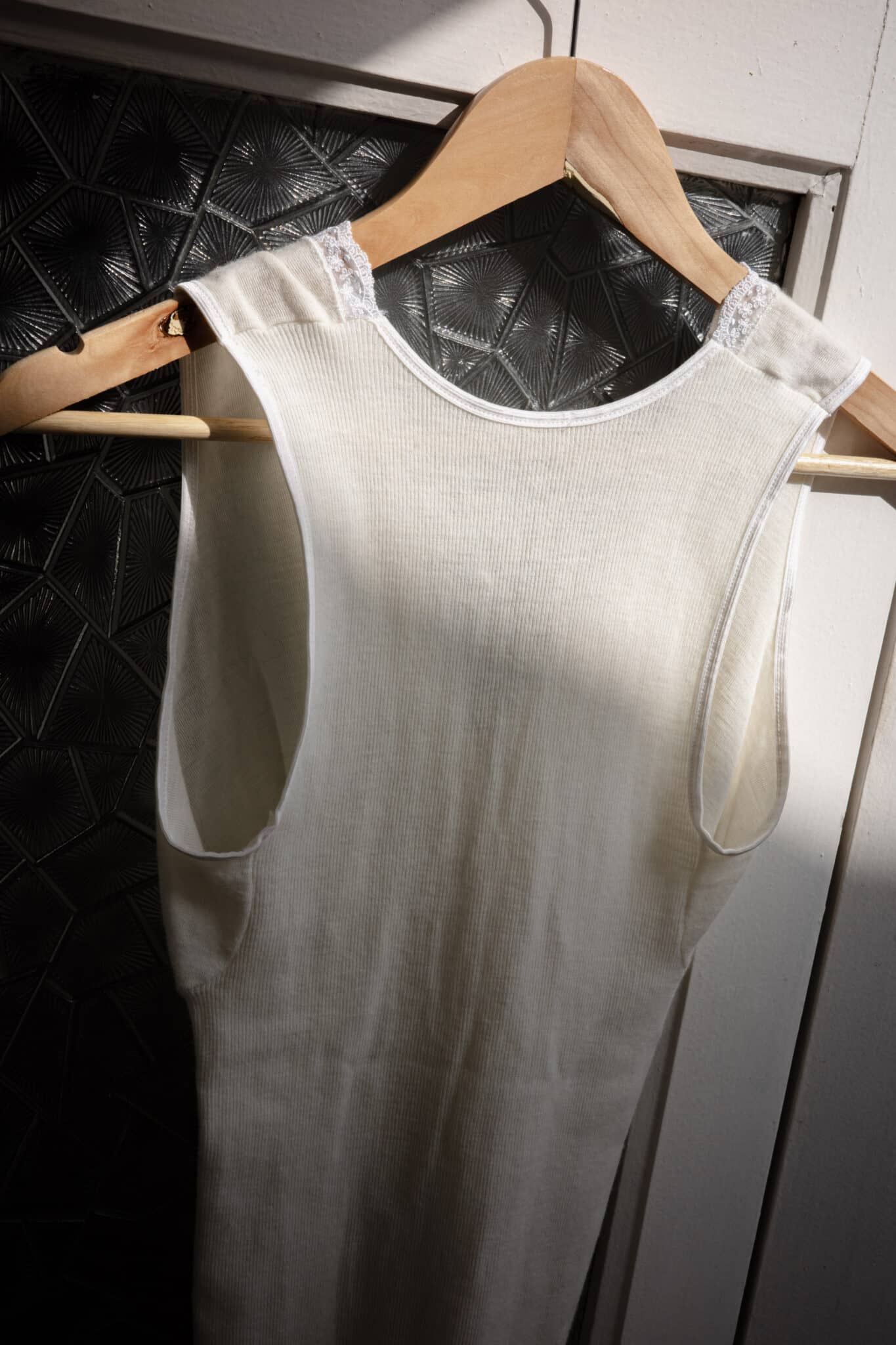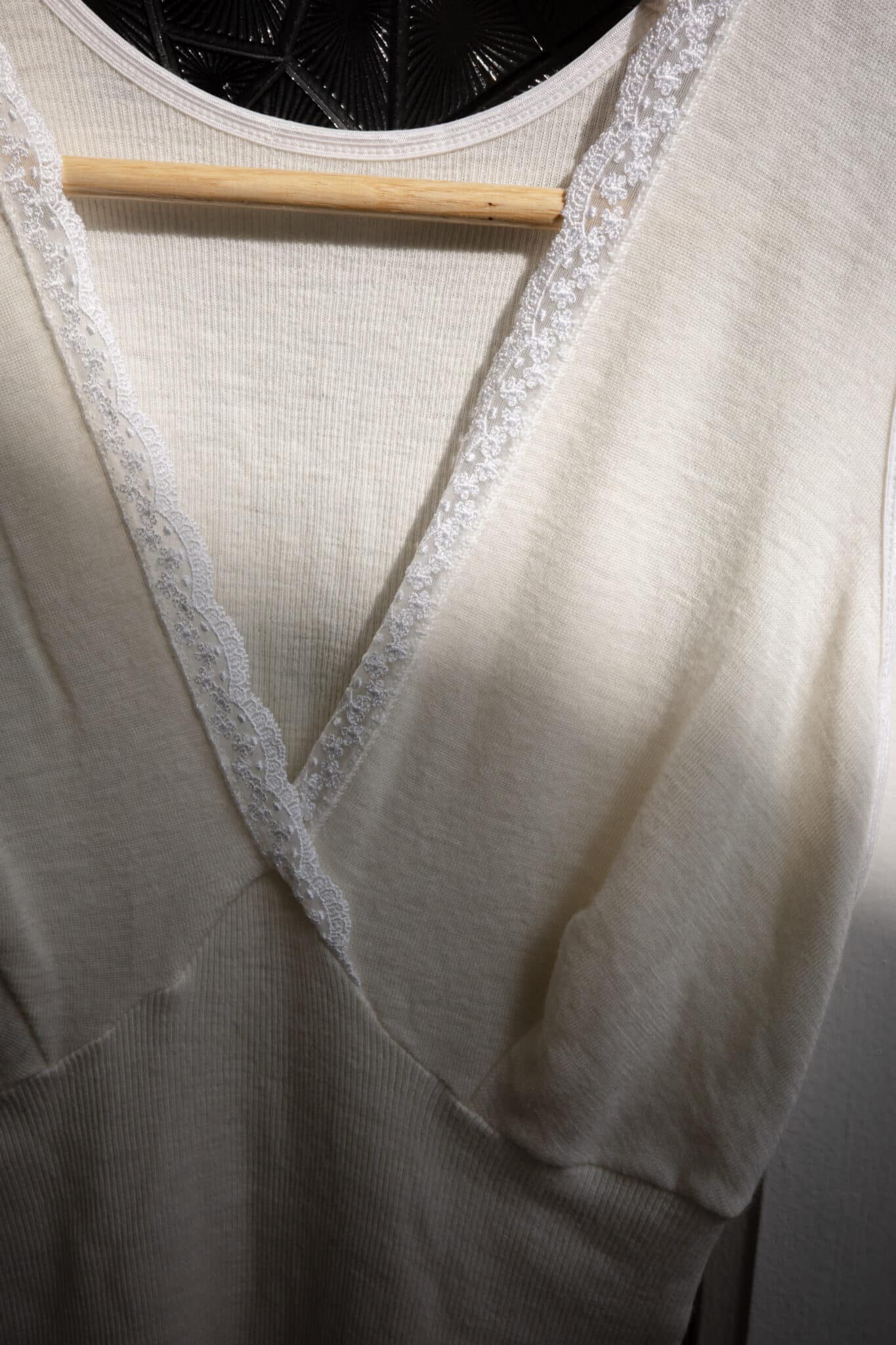 floral lace trim v-neck tank top – ribbed tank with deep V-neckline and floral lace trim. Shaped bust seams and stretch ribbed knit create a close fit.
