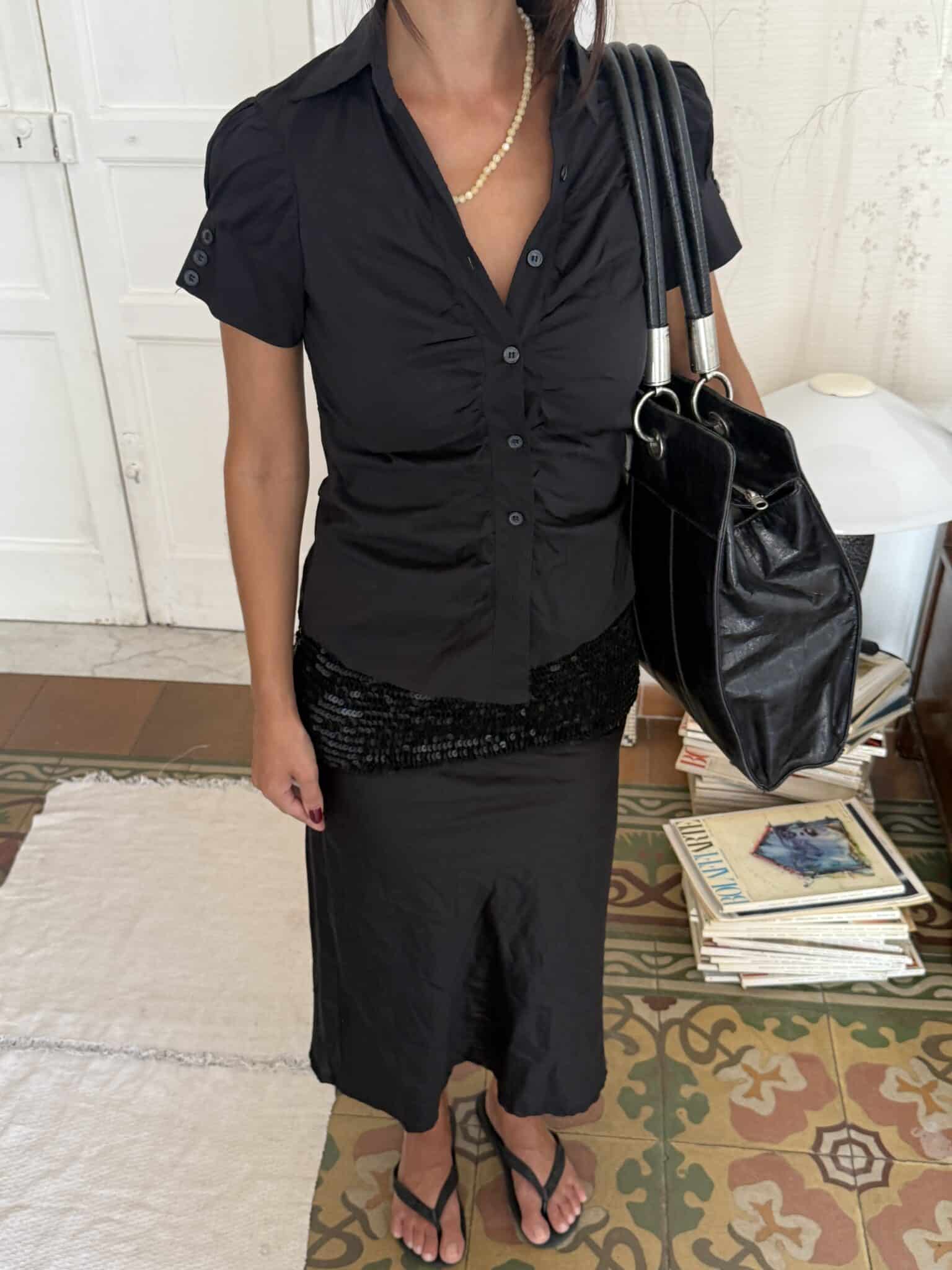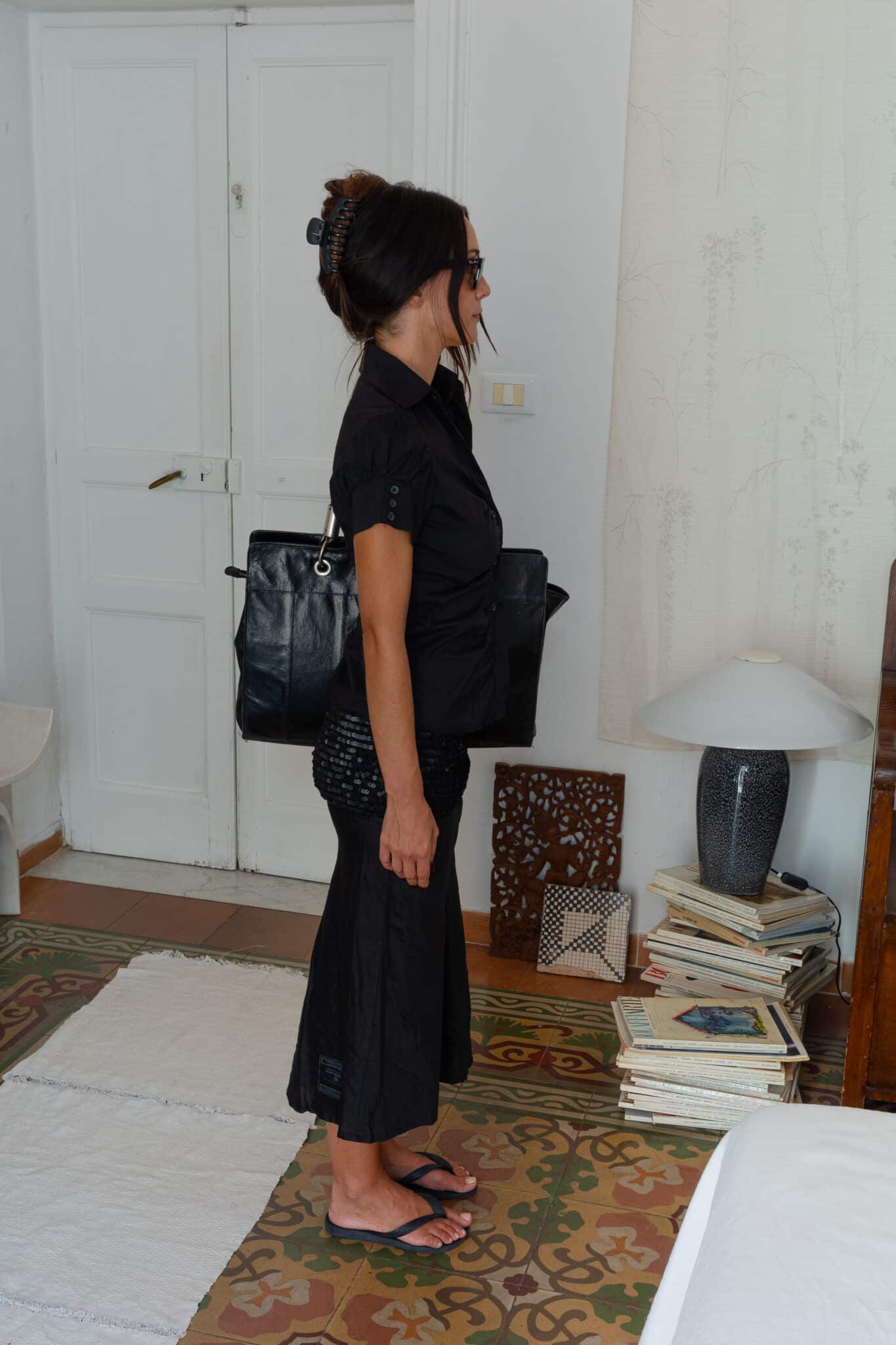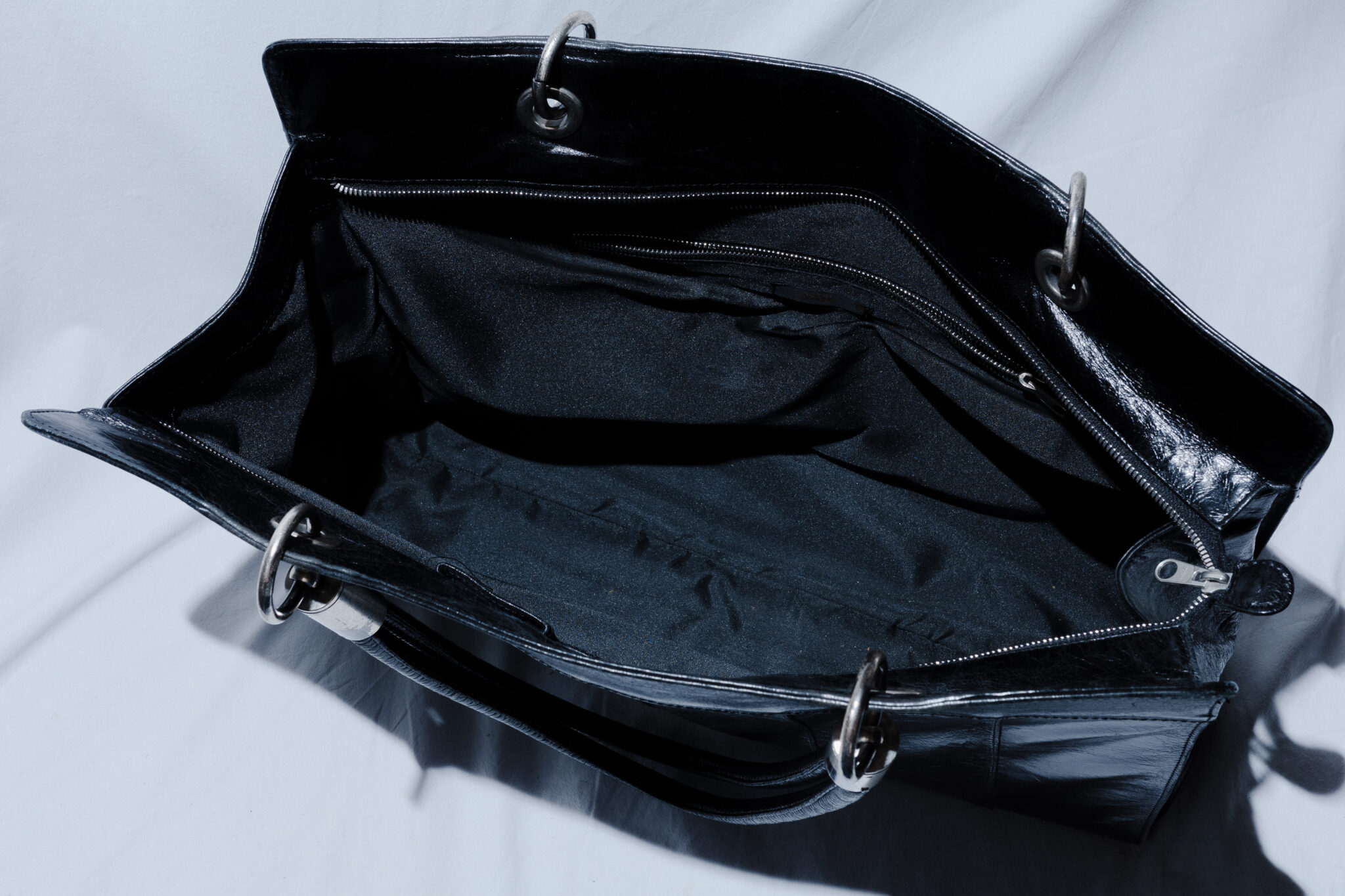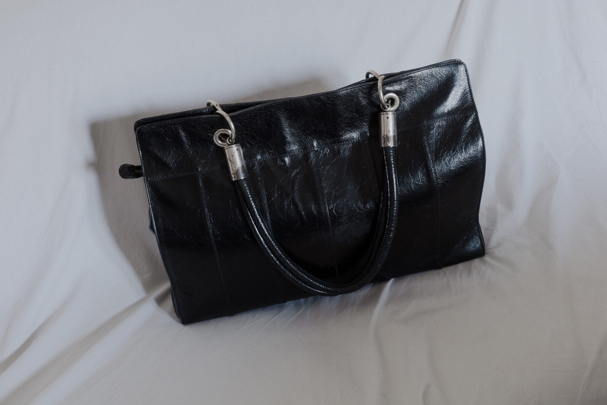 Large Black Leather Tote Bag – structured black leather tote with double handles and silver hardware details. Spacious and versatile design.