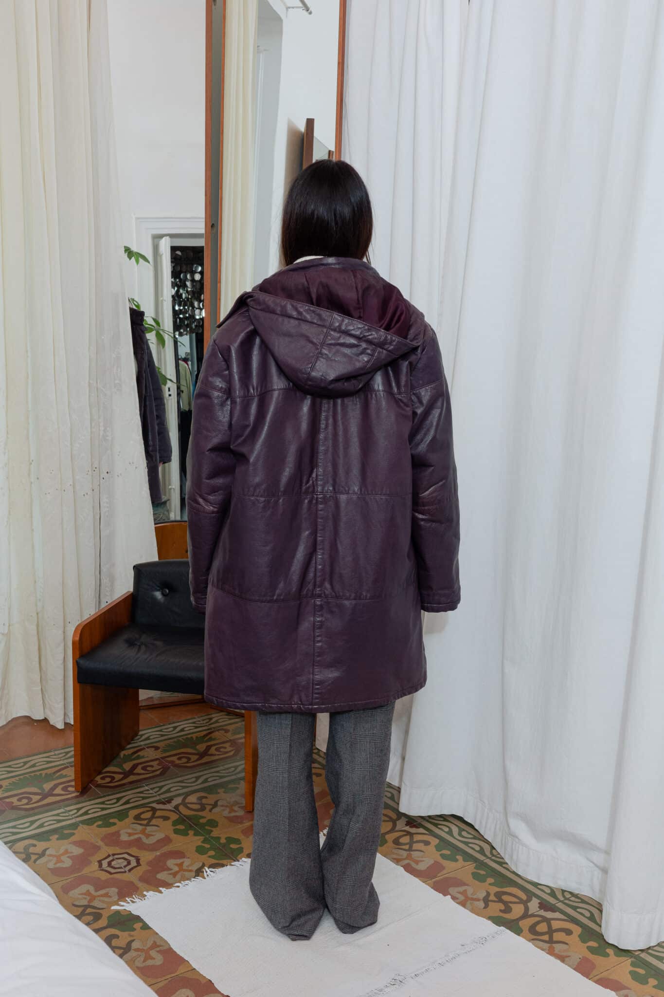 dark plum leather hooded coat. Oversized leather coat in deep plum tone with detachable hood and snap button closure.