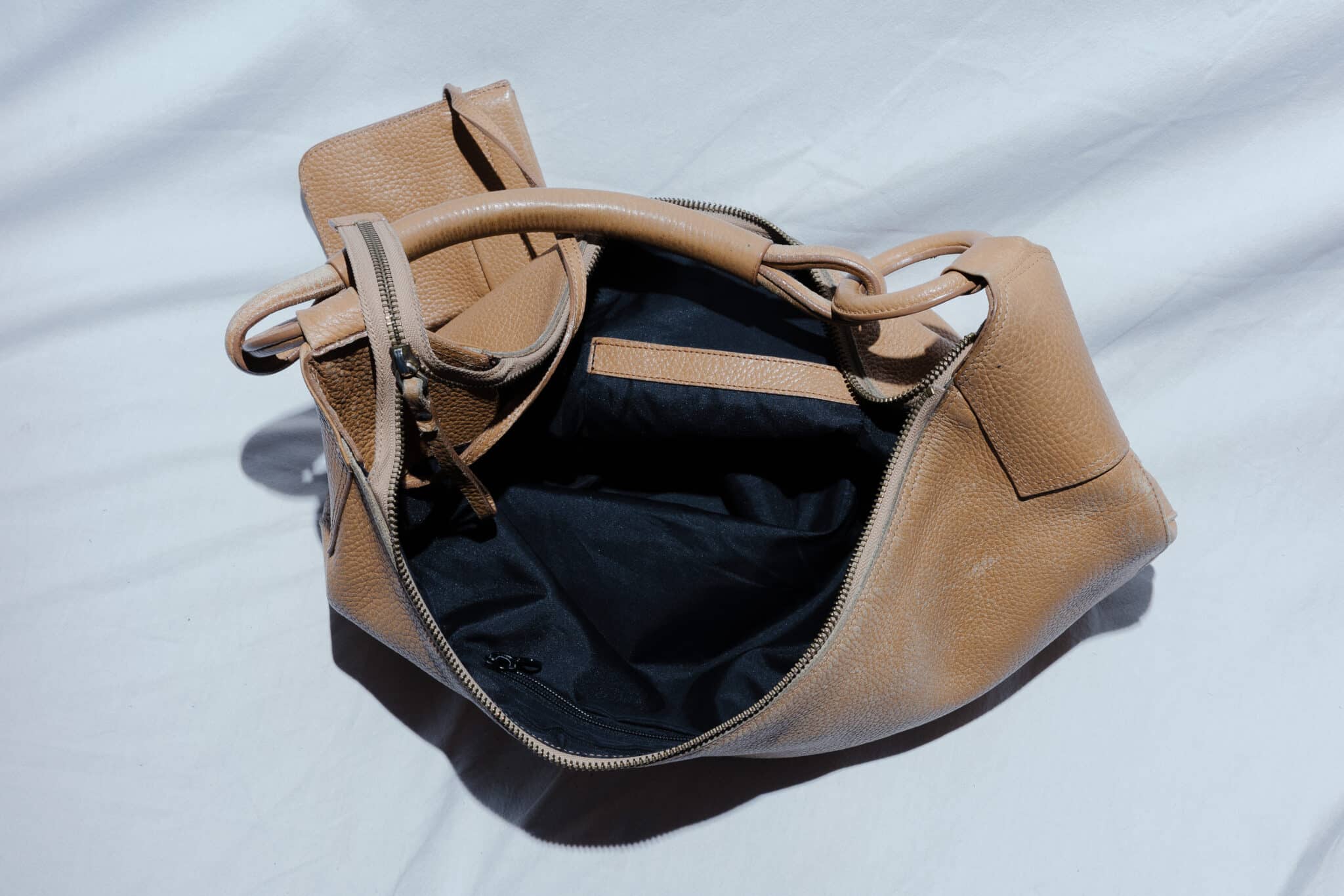 Rounded shoulder bag in a sack-inspired shape with a zip closure. The interior is fully lined, includes a secure zip pocket, and features a leather strap with clasp attachment. Comes with a matching small leather pouch.