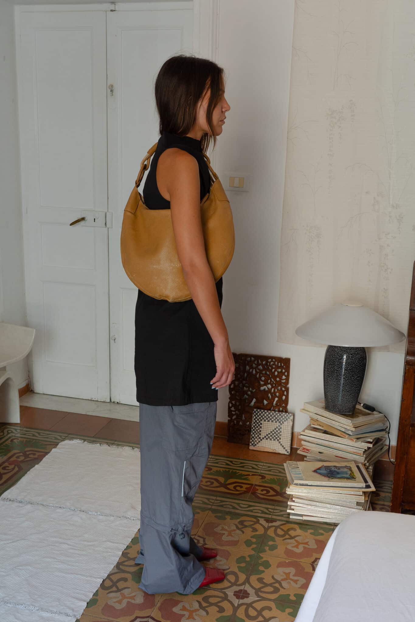 Rounded shoulder bag in a sack-inspired shape with a zip closure. The interior is fully lined, includes a secure zip pocket, and features a leather strap with clasp attachment. Comes with a matching small leather pouch.
