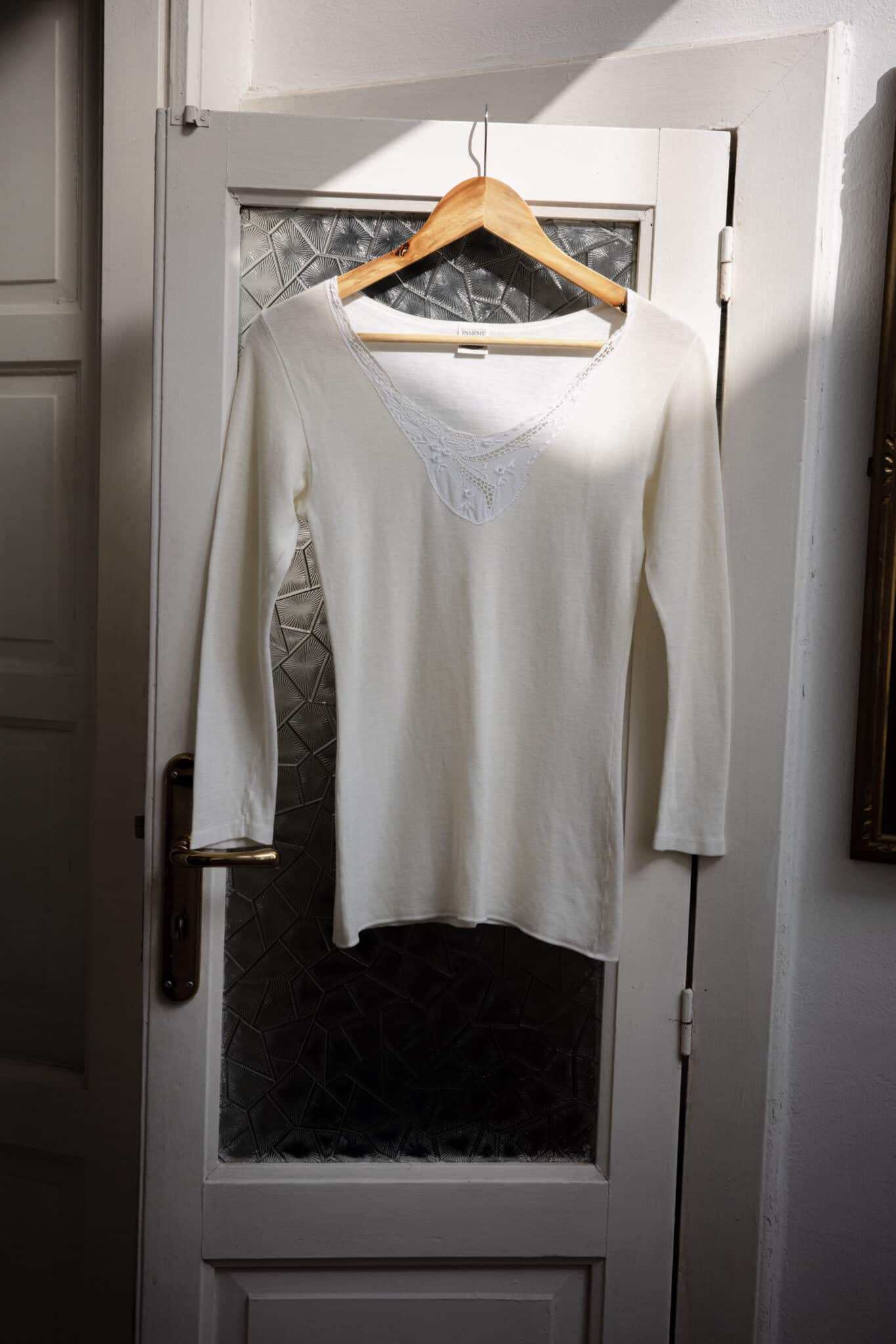 Long-sleeve knit top with a softly fitted silhouette and an embroidered V-shaped neckline. Designed with slim sleeves, a clean shoulder line, and a delicate embroidered insert with floral and openwork details at the front.