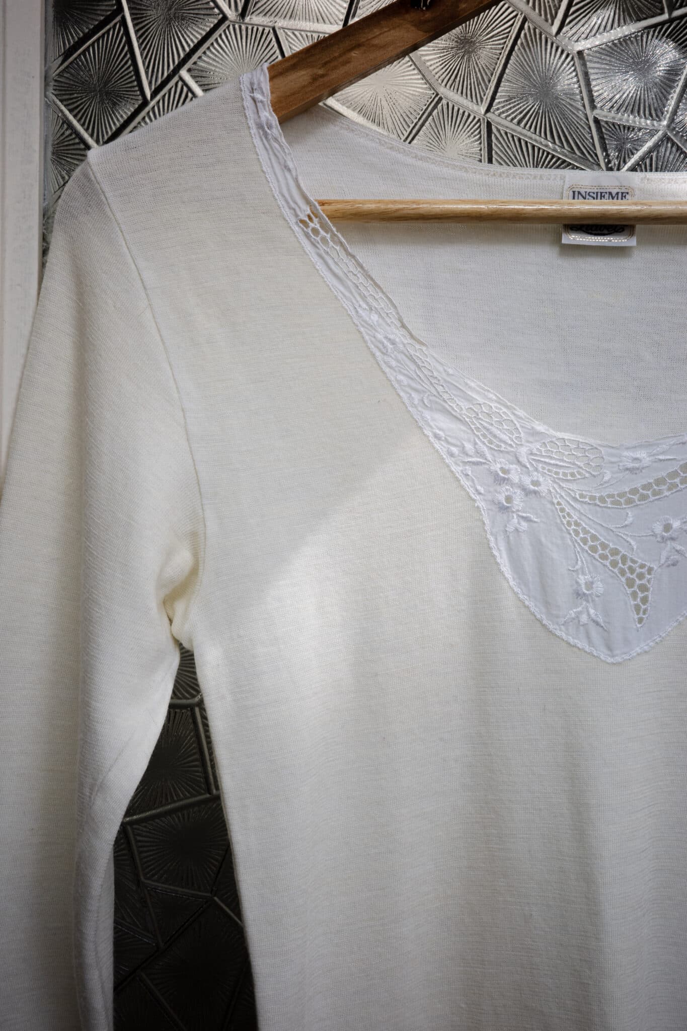 Long-sleeve knit top with a softly fitted silhouette and an embroidered V-shaped neckline. Designed with slim sleeves, a clean shoulder line, and a delicate embroidered insert with floral and openwork details at the front.