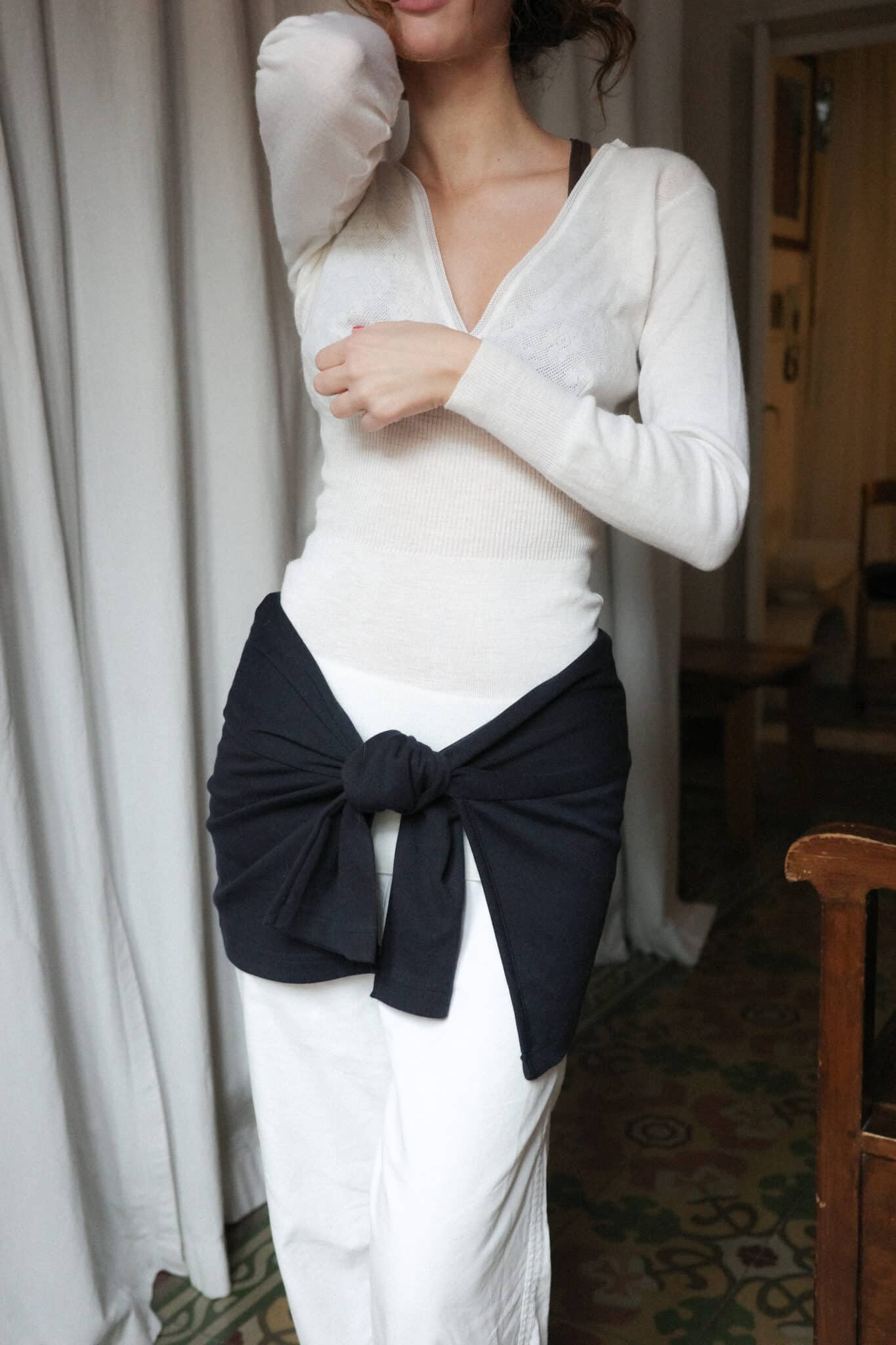 long-sleeve knit top with a deep V-neckline and delicate openwork texture. fitted ribbed waist for definition and slim full-length sleeves