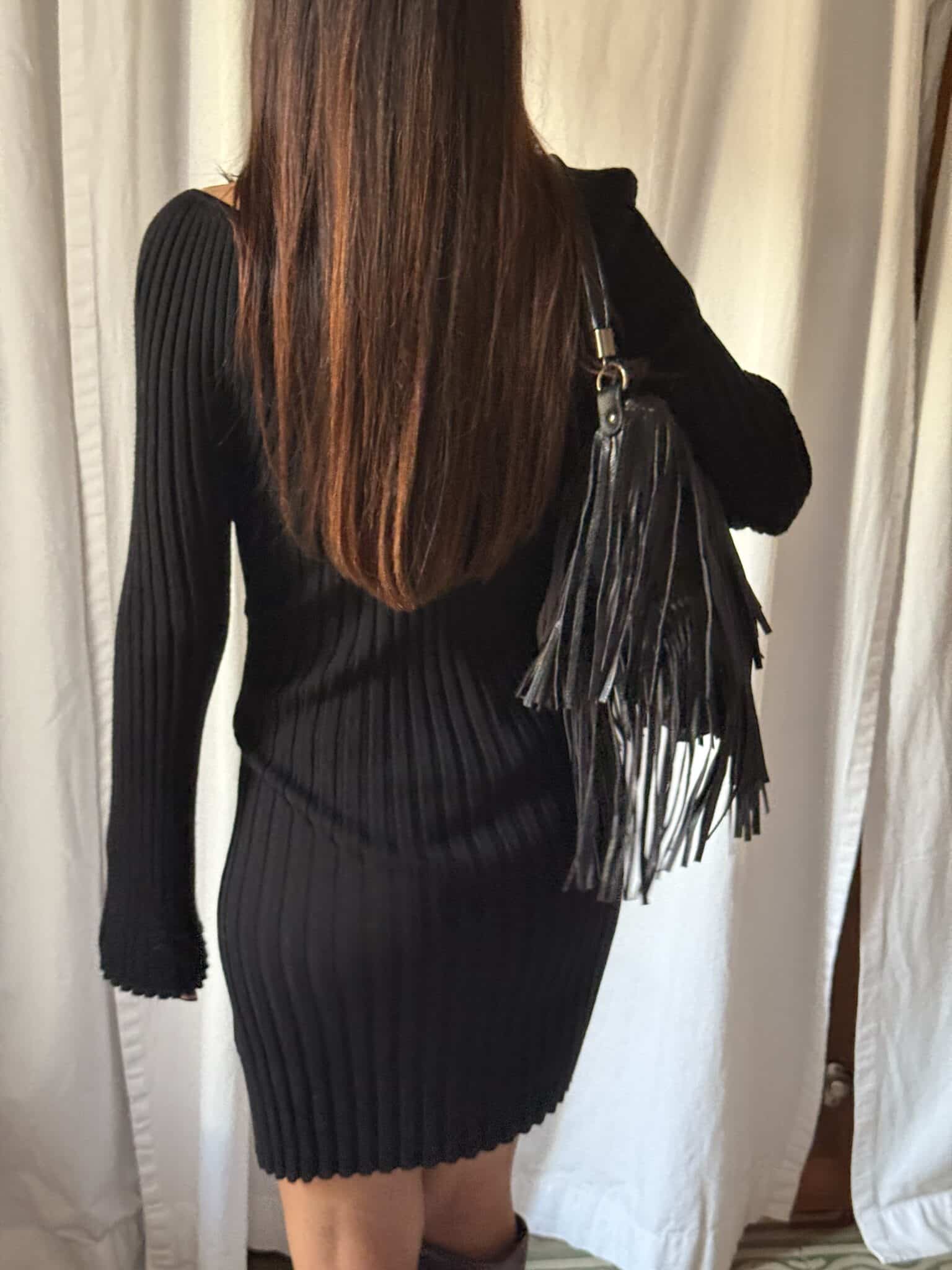 Black ribbed merino mini dress – long-sleeved mini dress crafted from 100% merino wool with a soft ribbed texture. designed with a boat neckline, subtle stretch and straight fit that follows the body’s shape.
