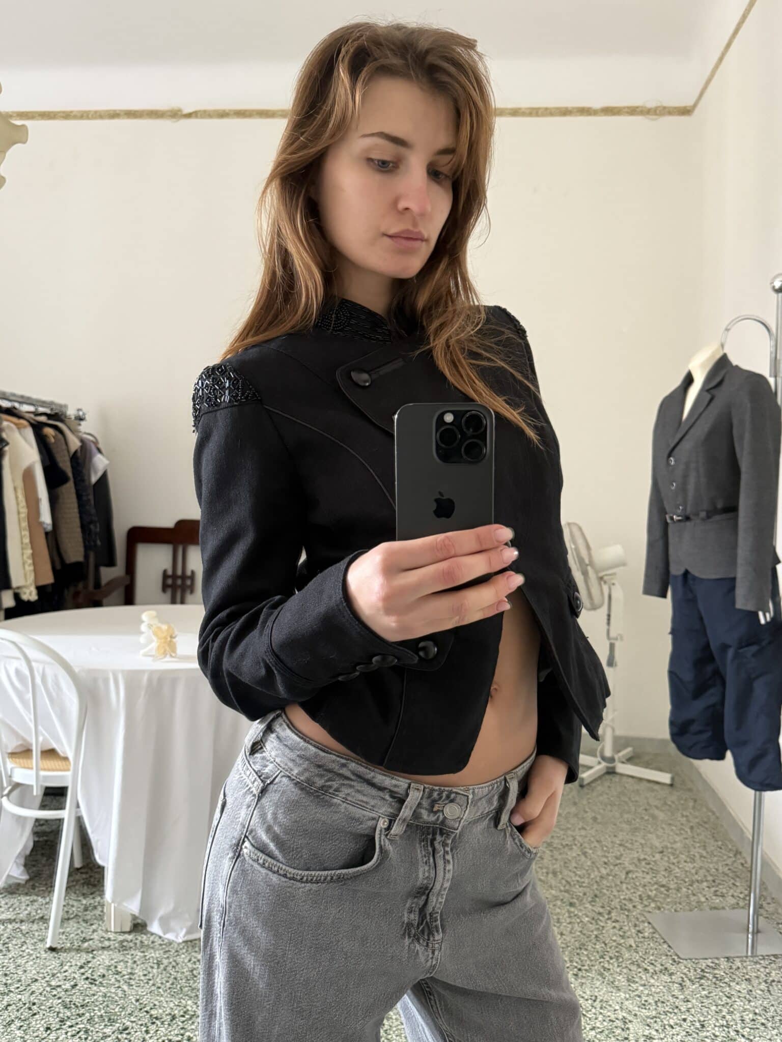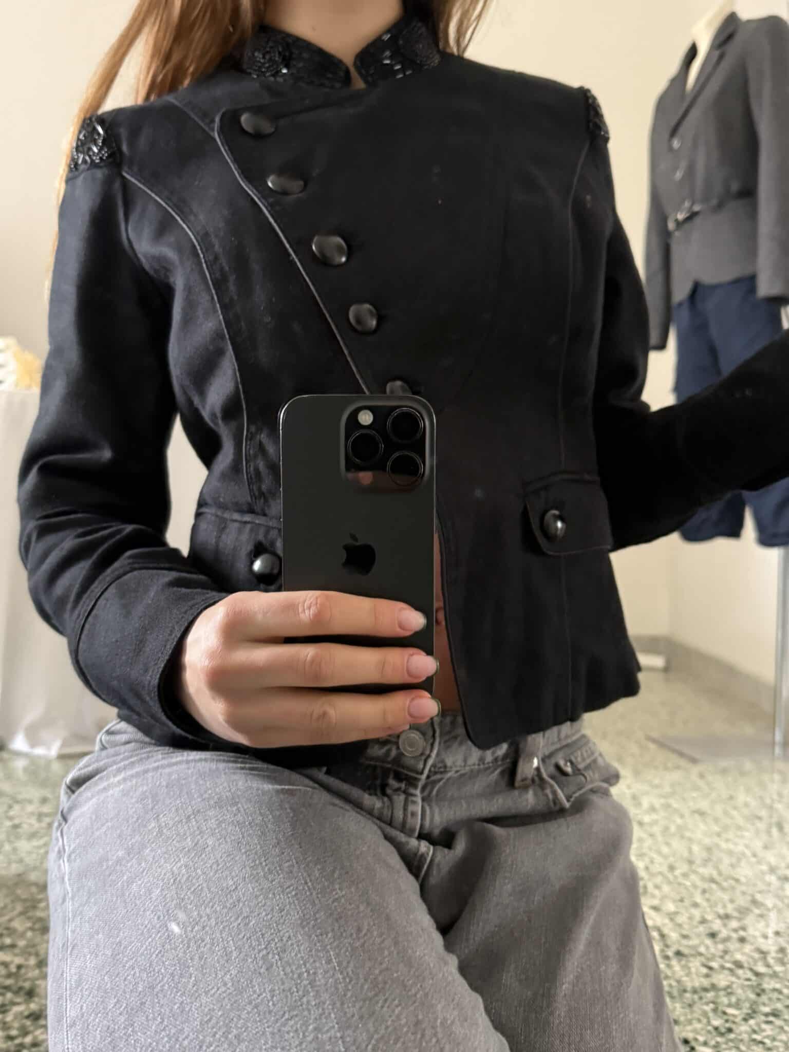 napoleonic jacket with rhinestone detailing – structured black jacket with asymmetric button closure, high collar and subtle rhinestone accents at the collar and shoulders.