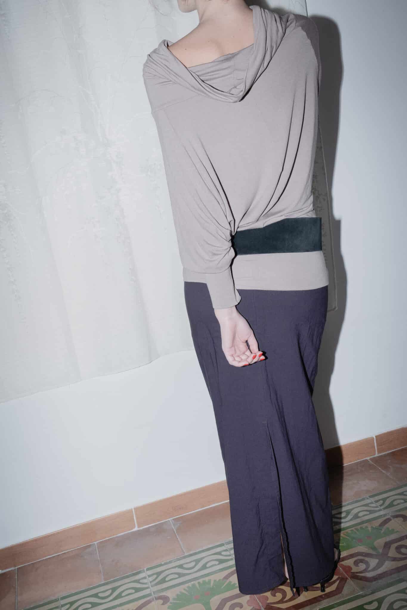 off-shoulder draped top / mini dress. designed with a wide draped neckline that can be styled slightly off shoulder. the sleeves are long and narrow with a natural slouch, and the body falls in relaxed gathers at the waist. the fabric adapts to movement without losing shape.