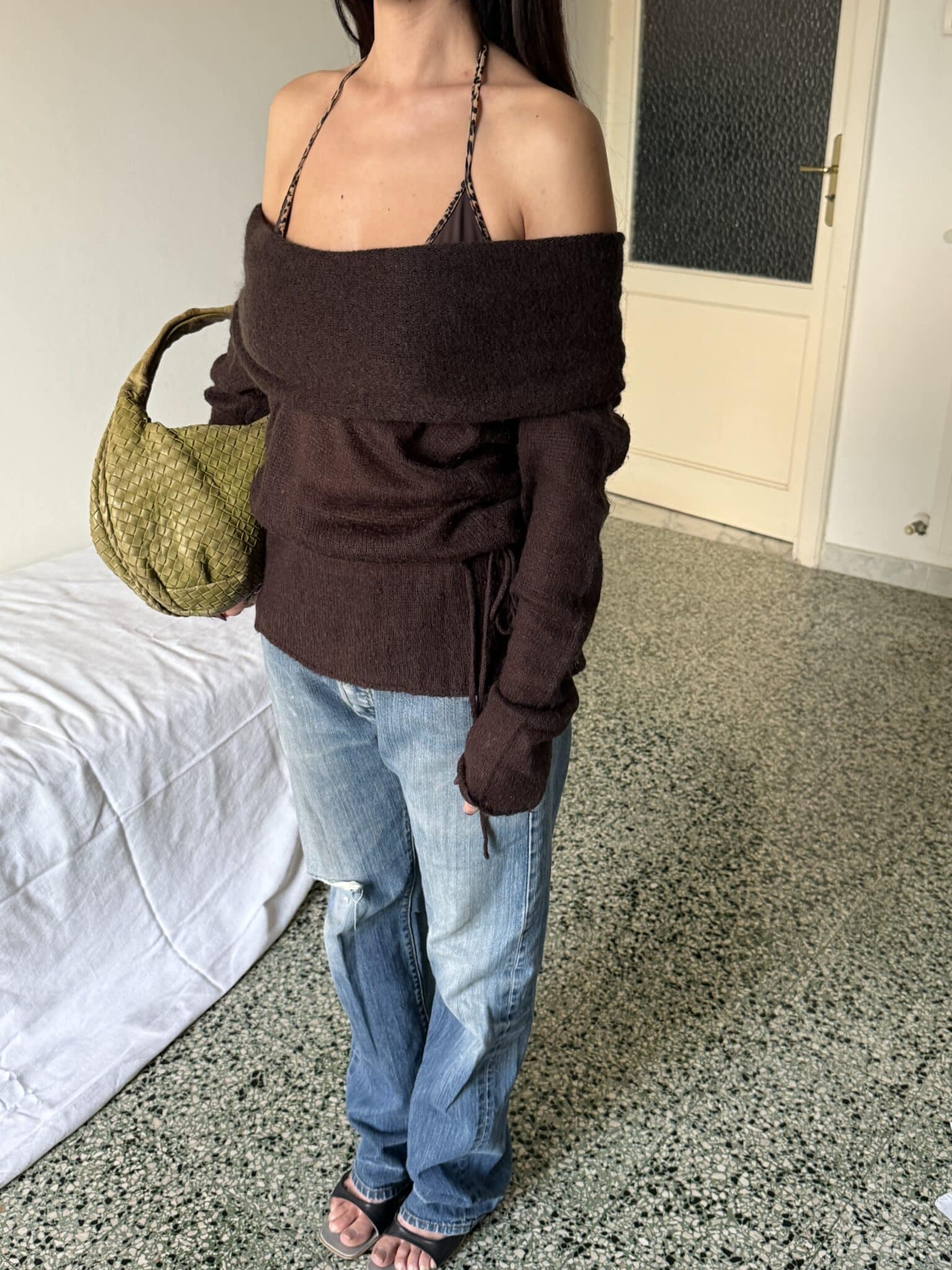 off-shoulder knit sweater – soft brown knit sweater with wide off-shoulder neckline, wrap-style waist tie and fitted silhouette