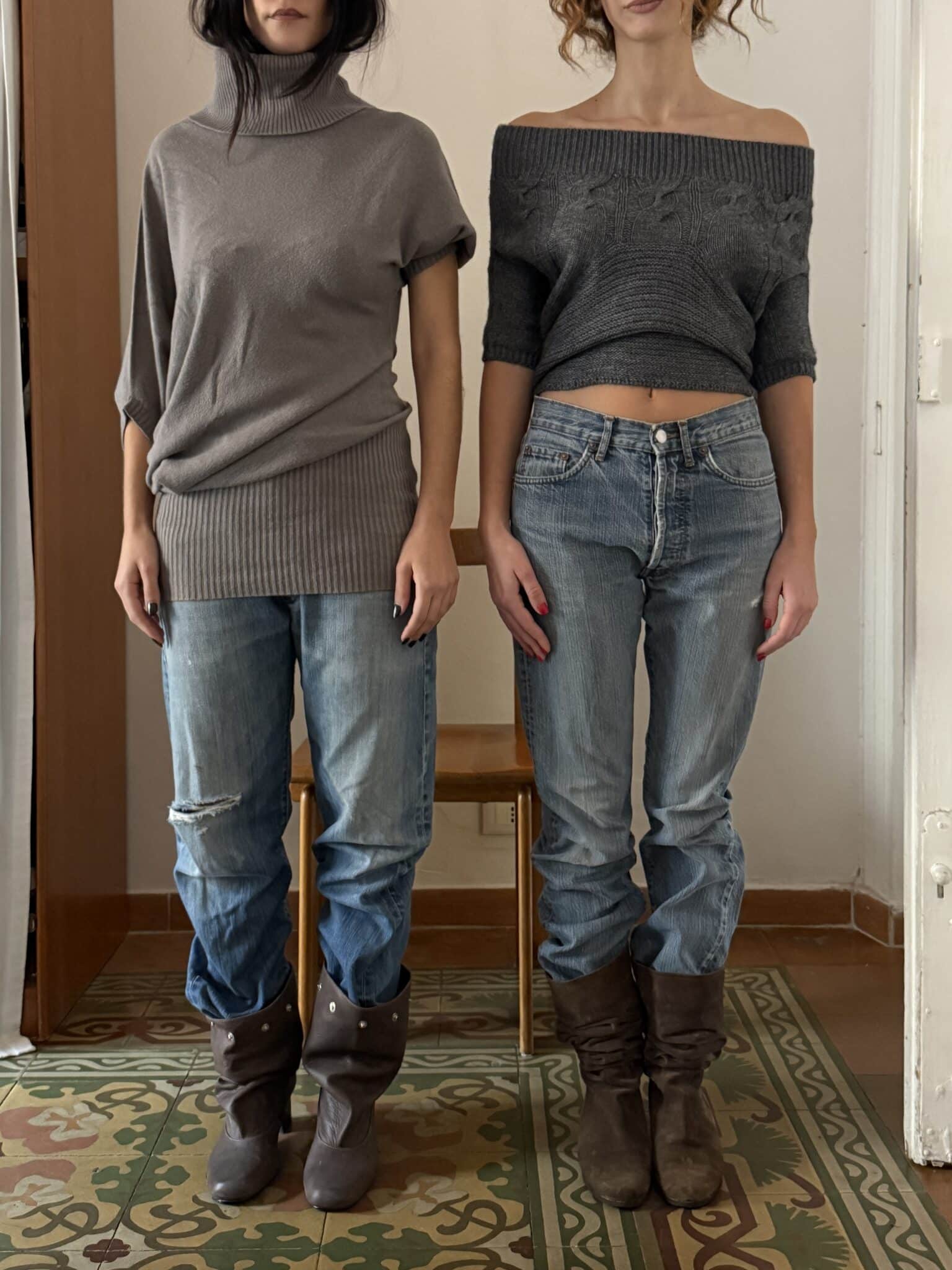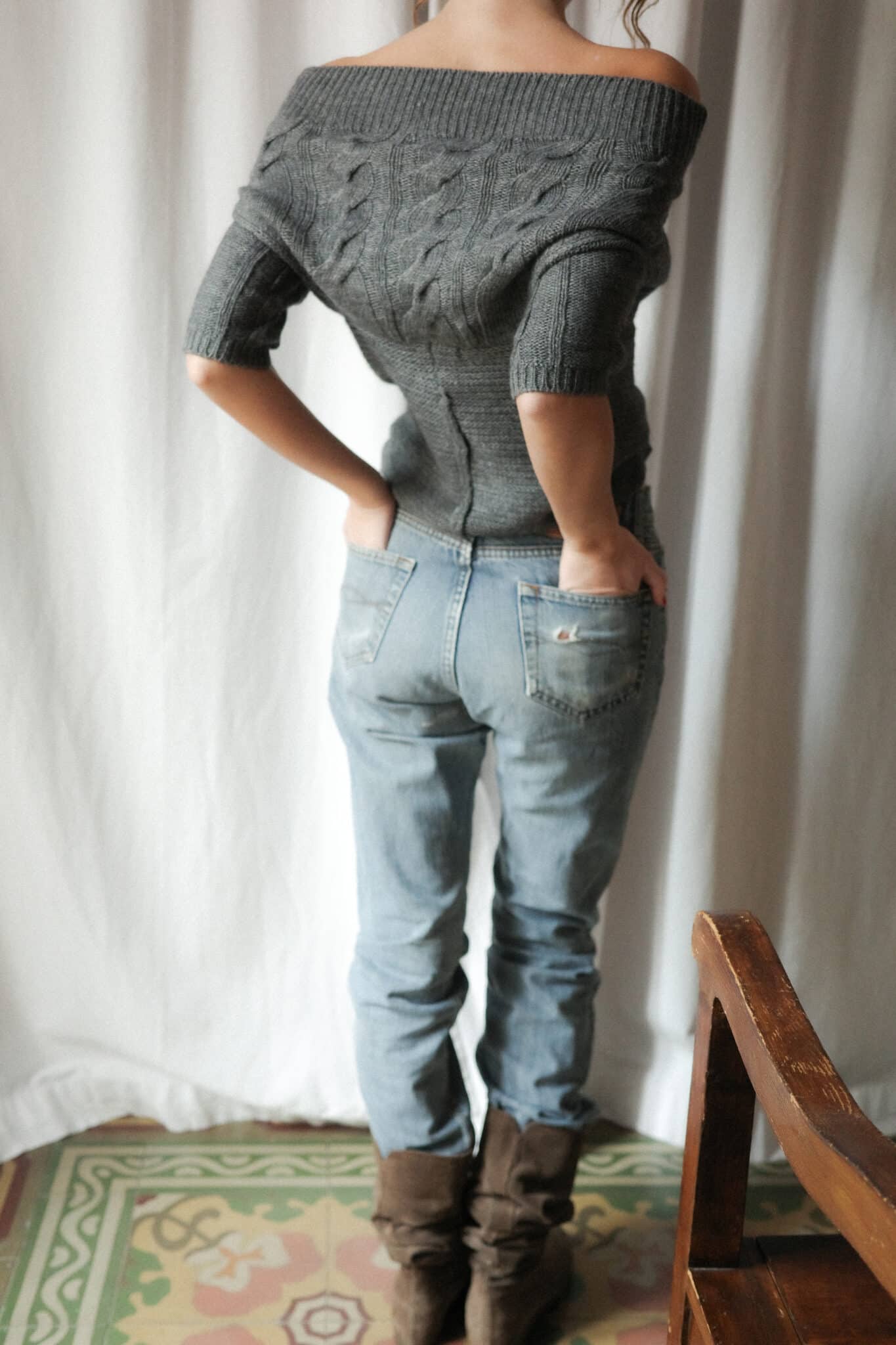 Off-shoulder knit top in muted grey with a ribbed neckline and three-quarter sleeves. Soft knit texture with a cropped length and subtle cable detailing.