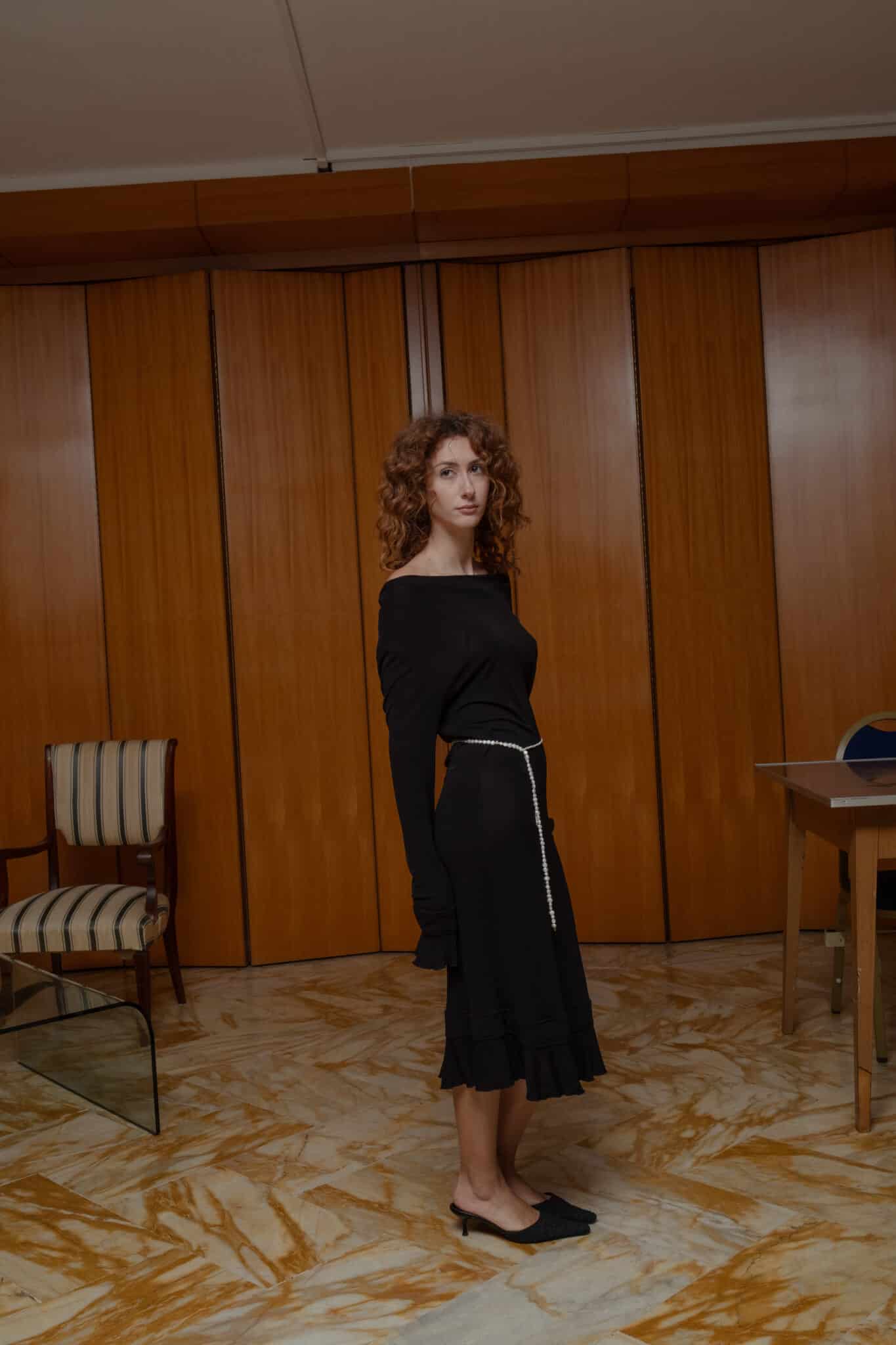 off-shoulder midi dress with a fitted silhouette, long sleeves, and subtle ruffle hem detailing. Soft stretch fabric with a clean, minimal finish