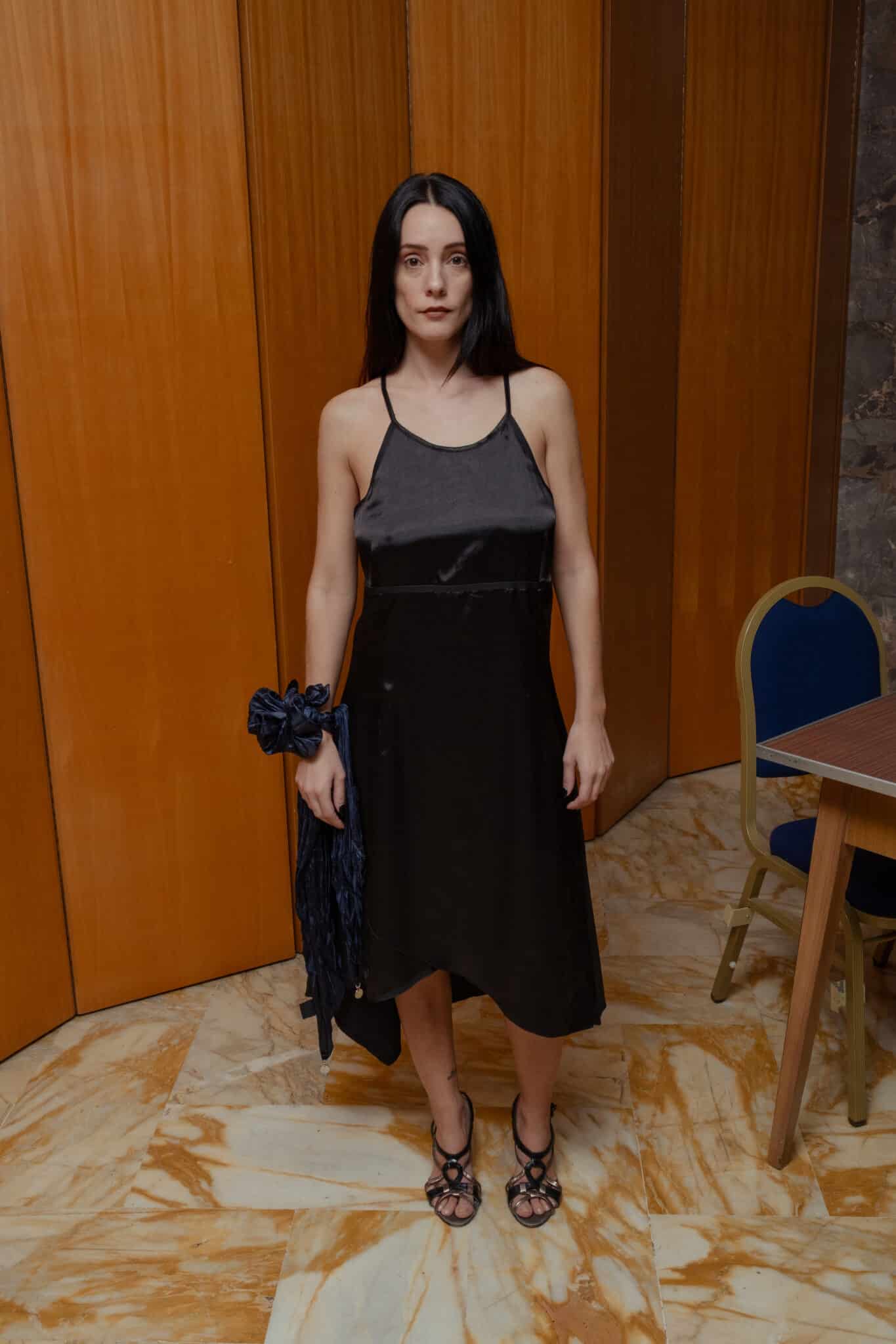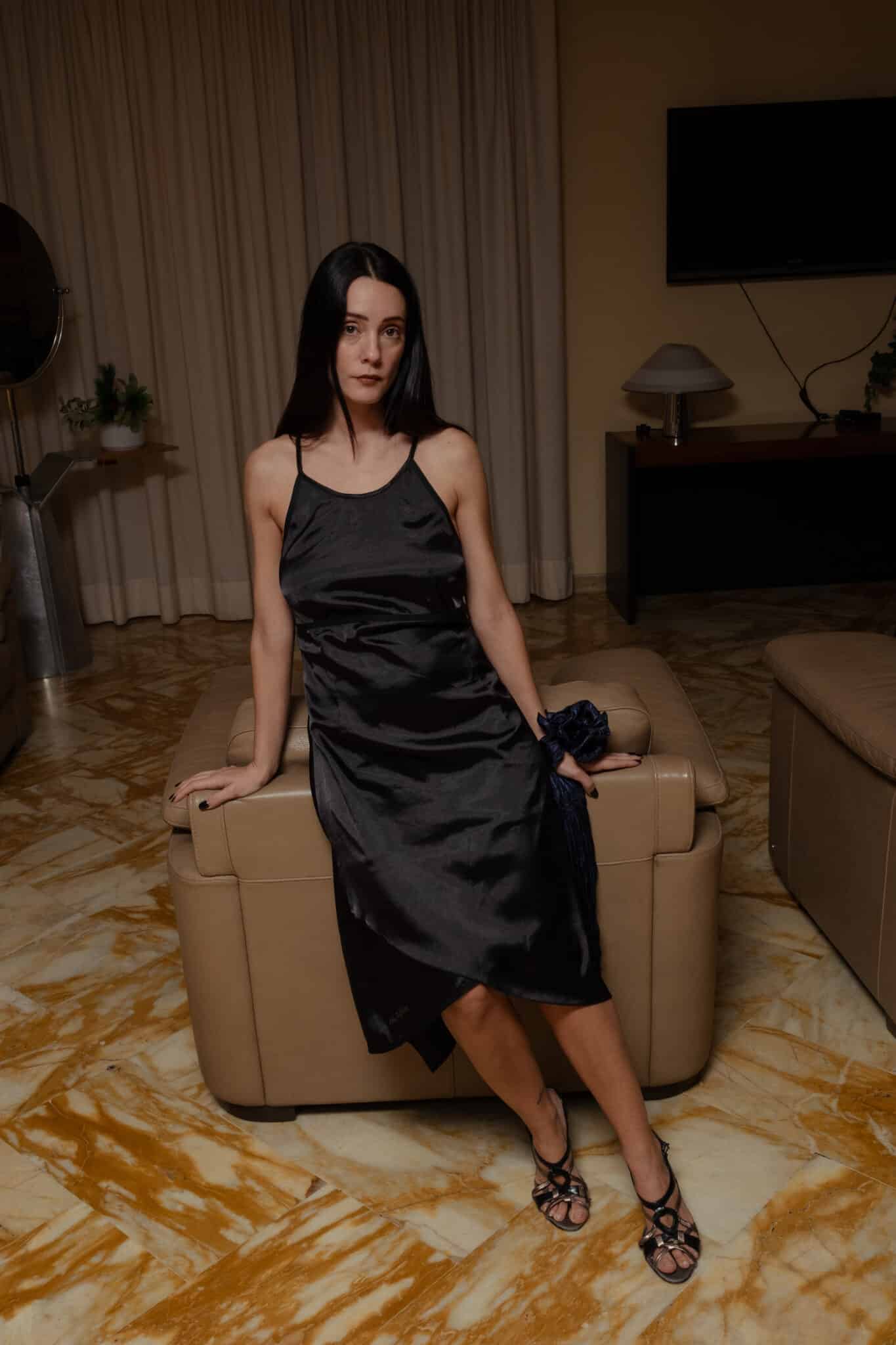open back midi slip dress with a fluid, lightweight feel and a soft sheen. Designed with thin shoulder straps and an open crossed back that adds structure without restricting movement. Cut in a relaxed midi length with a clean silhouette that follows the body without clinging.