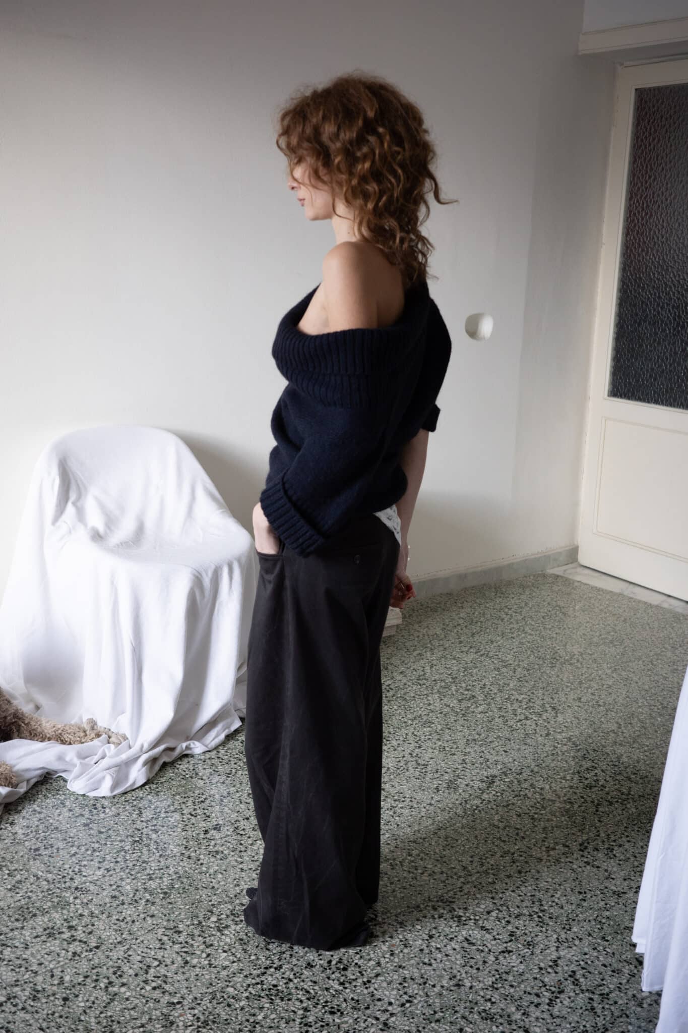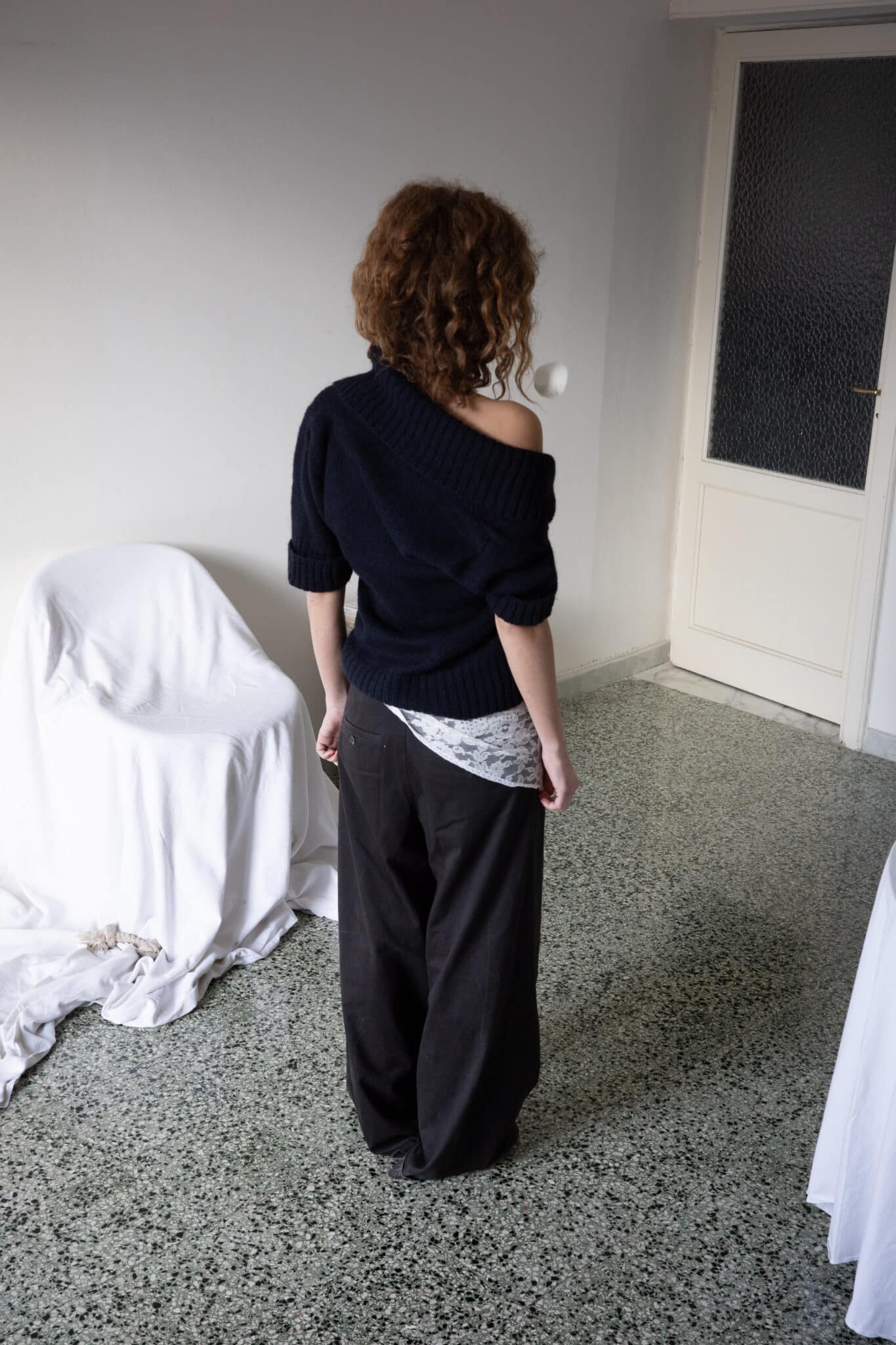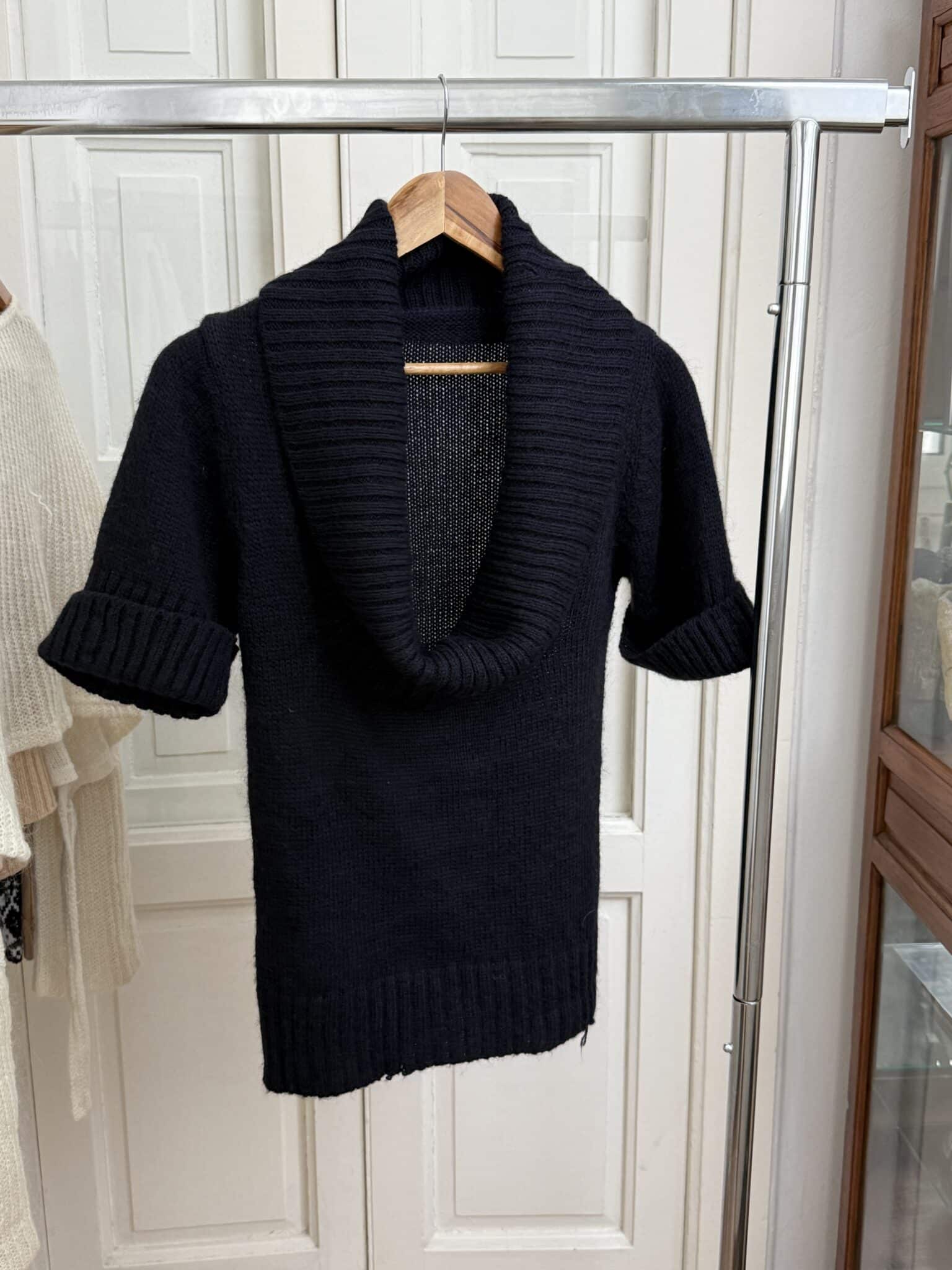 Blue wool and mohair blend sweater with a lowered open back and three-quarter sleeves. Soft knit texture with a relaxed, sculptural drape