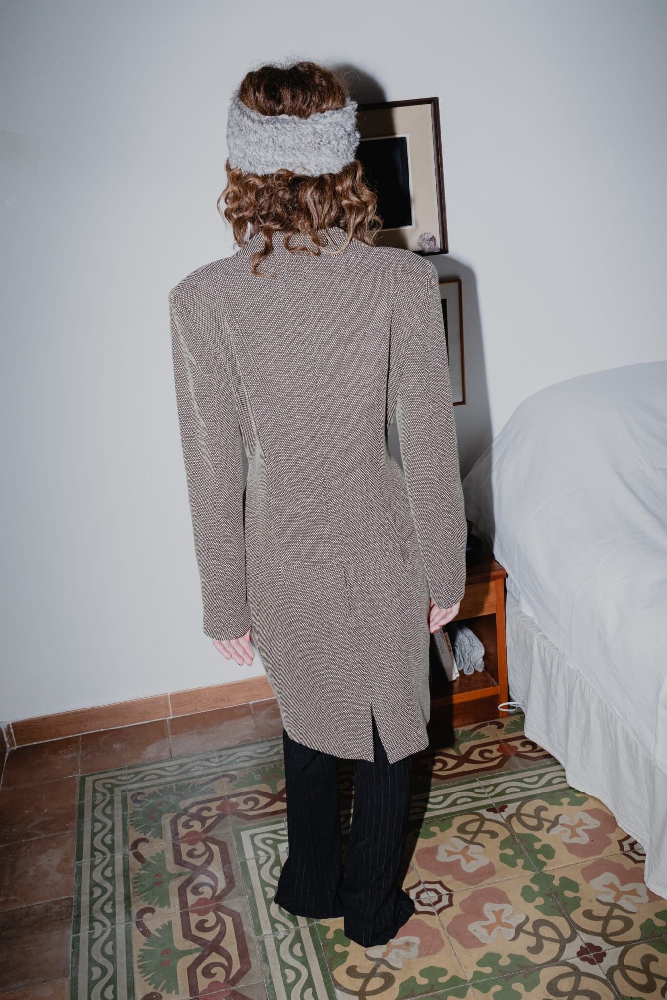 Tailored blazer in a structured silhouette with a defined waist, notched lapels, curved seams and brown button closure.