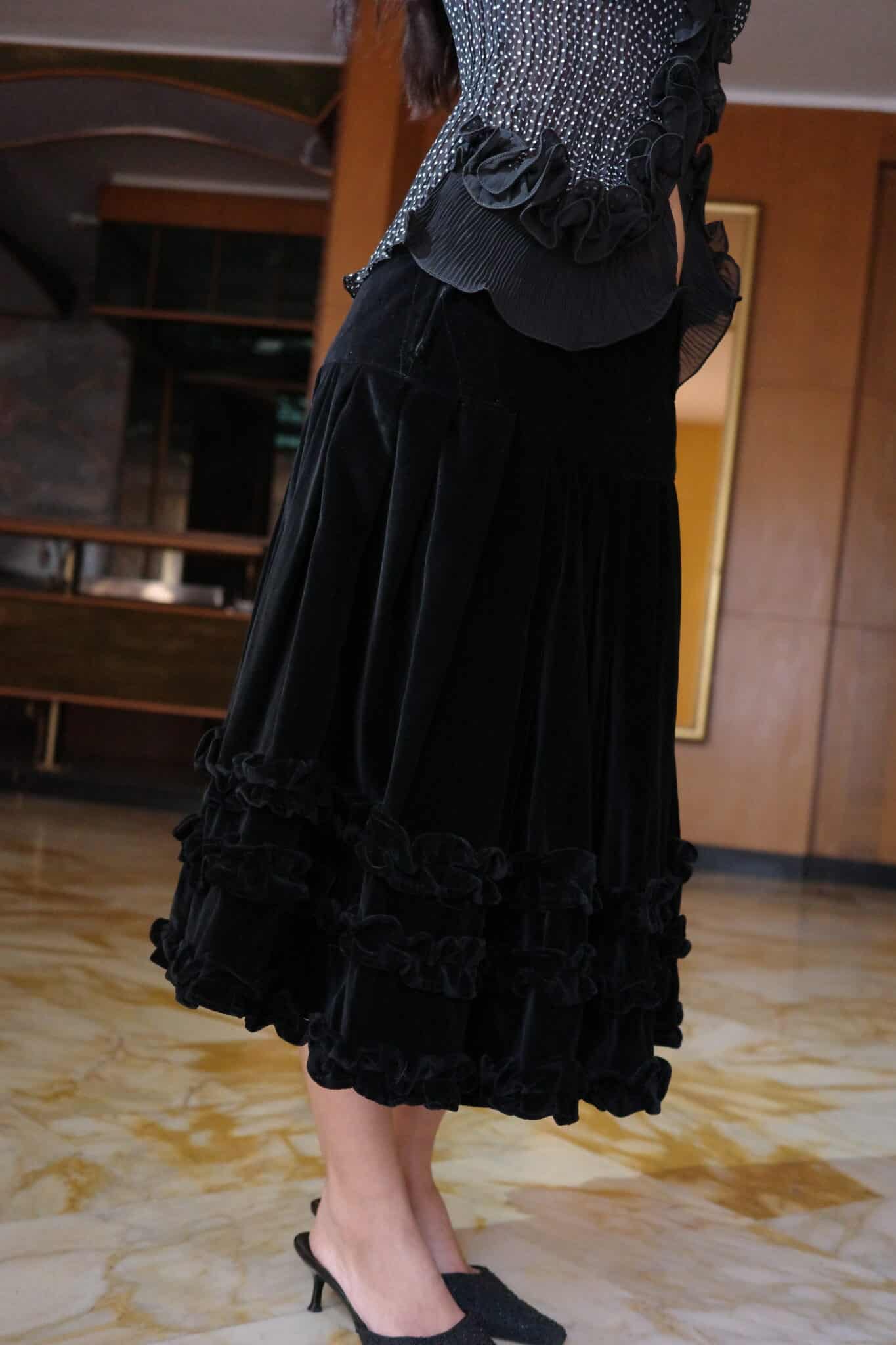 pleated velvet midi skirt w. ruffle hem designed with fine pleats and a layered ruffle hem that adds volume without excess. the skirt has a structured waistband that sits securely at the waist while allowing the pleated construction to move freely.