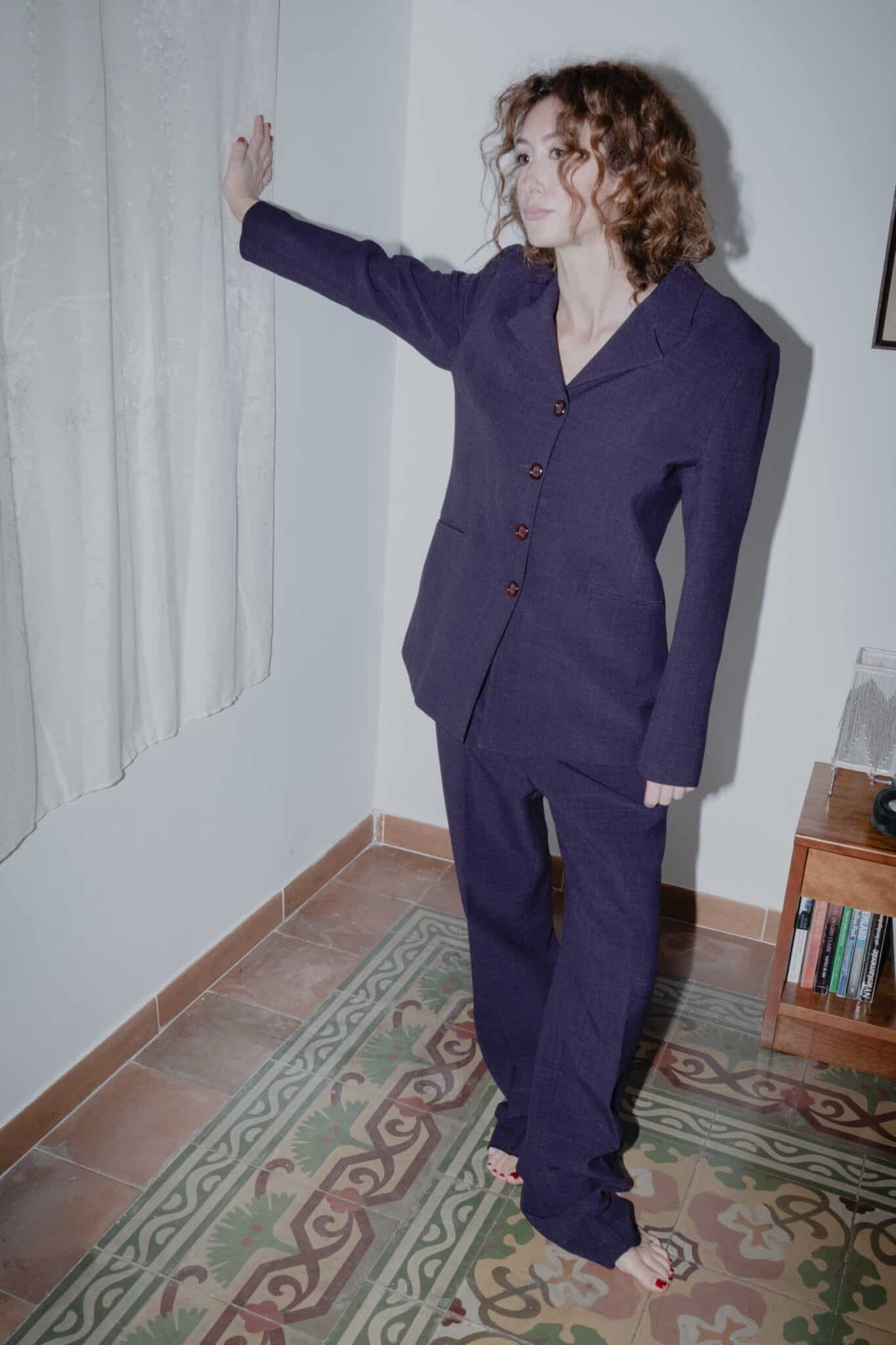purple longline blazer – structured longline blazer with shaping seams, refined shoulder construction and clean button closure. the longline cut follows the body naturally, supported by shaping seams that create a clean waist definition. shoulders are structured for a precise, tailored fit.