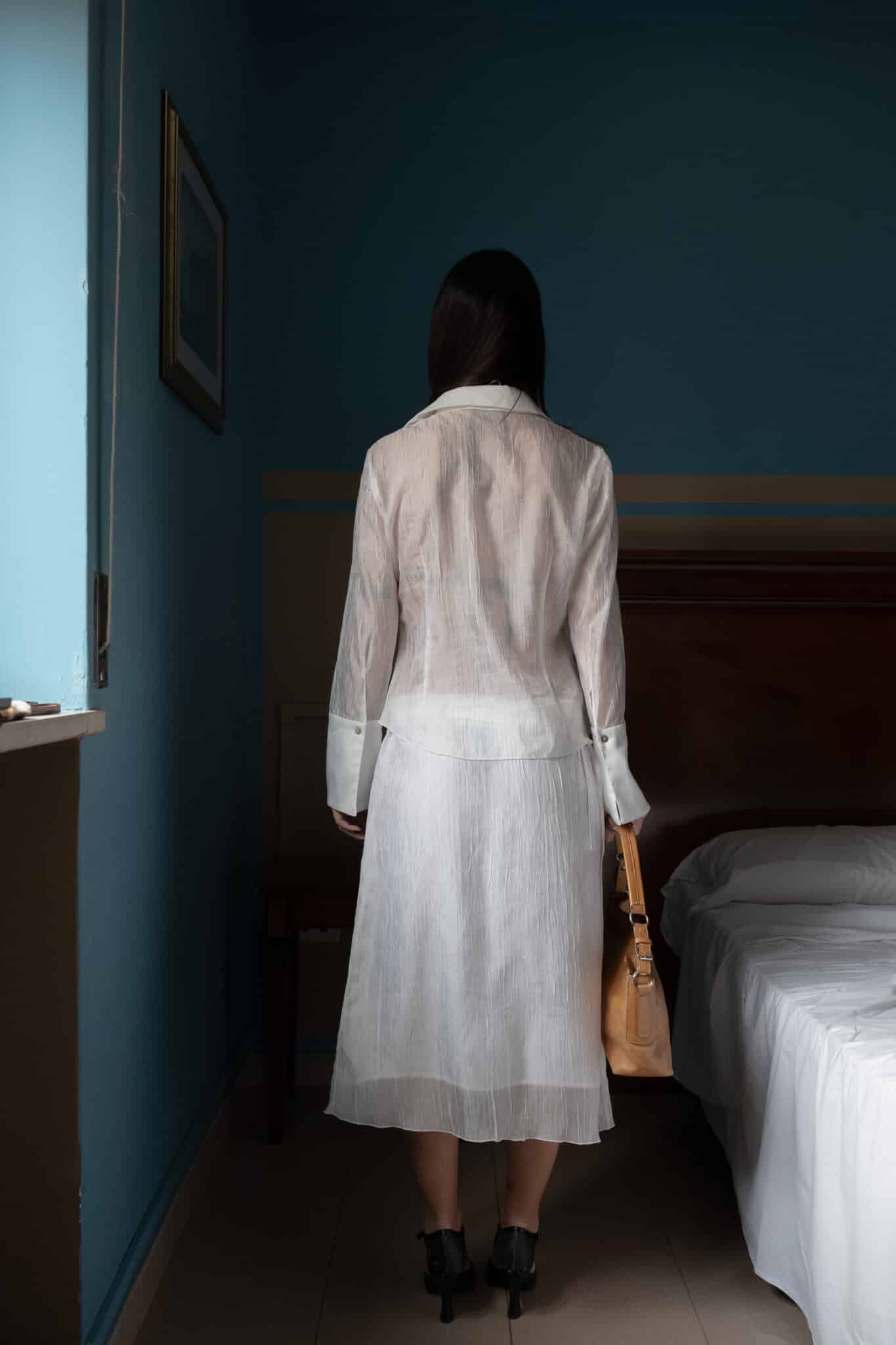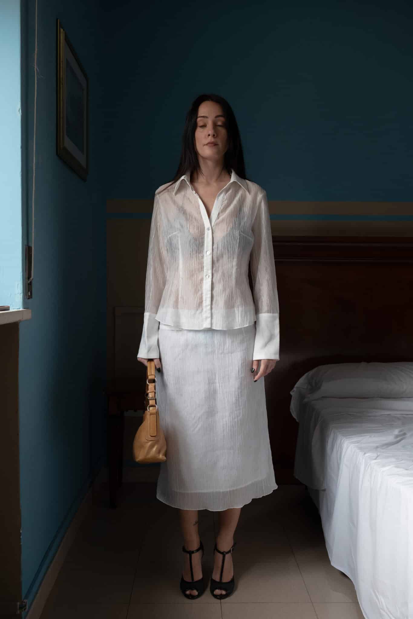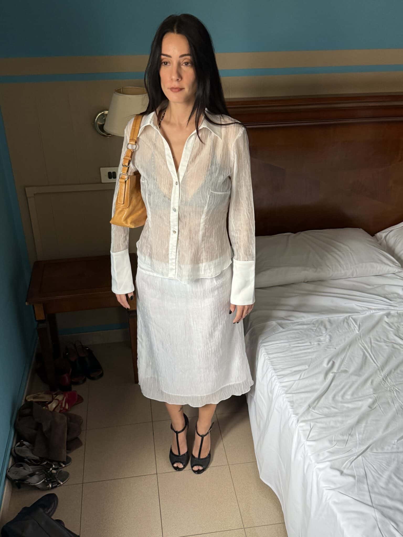 sheer shirt & skirt set sold together as one complete outfit. The shirt is made from a lightweight, semi-transparent fabric with a tailored fit, while the skirt features an additional inner layer for a more opaque finish and has a attached belt.