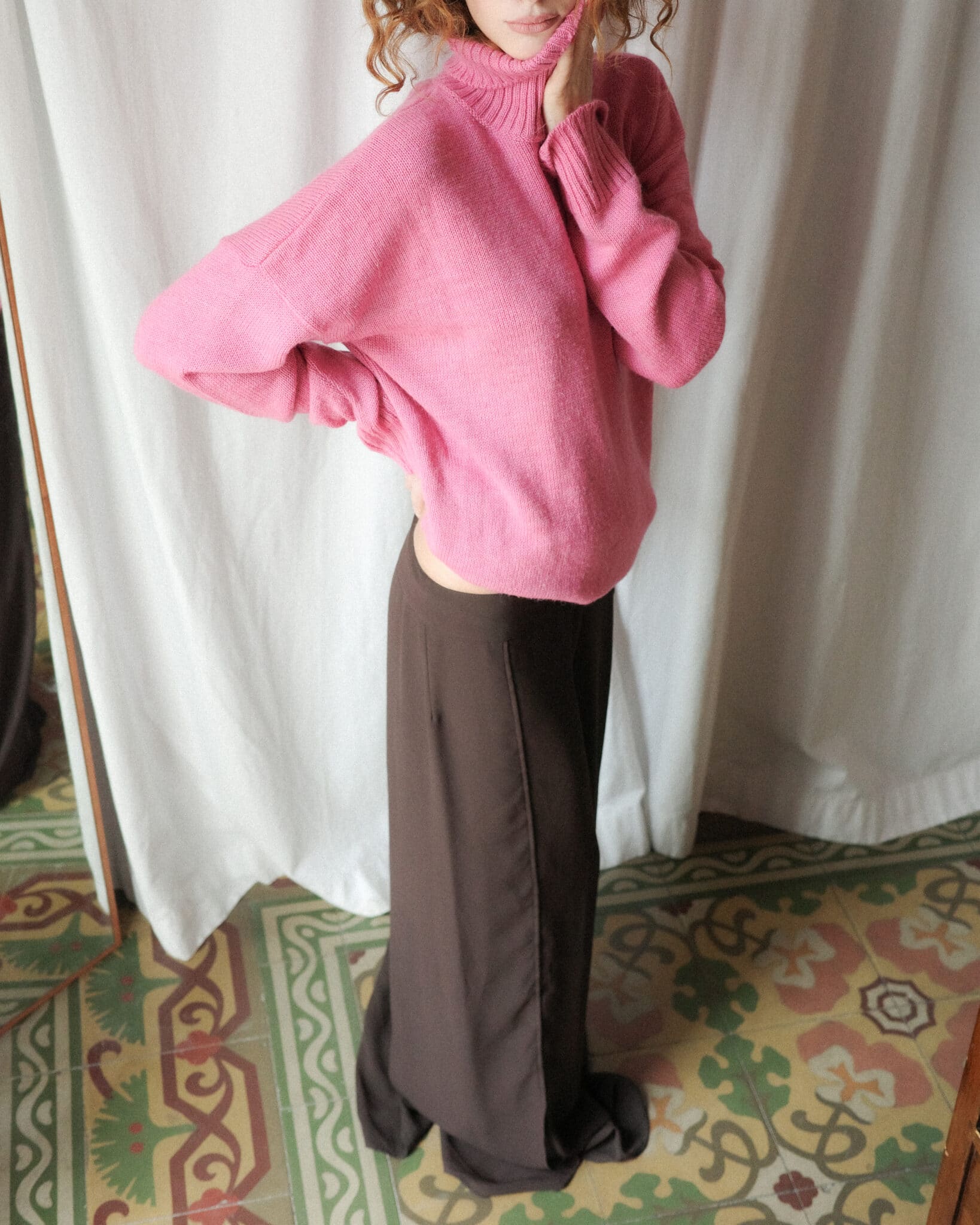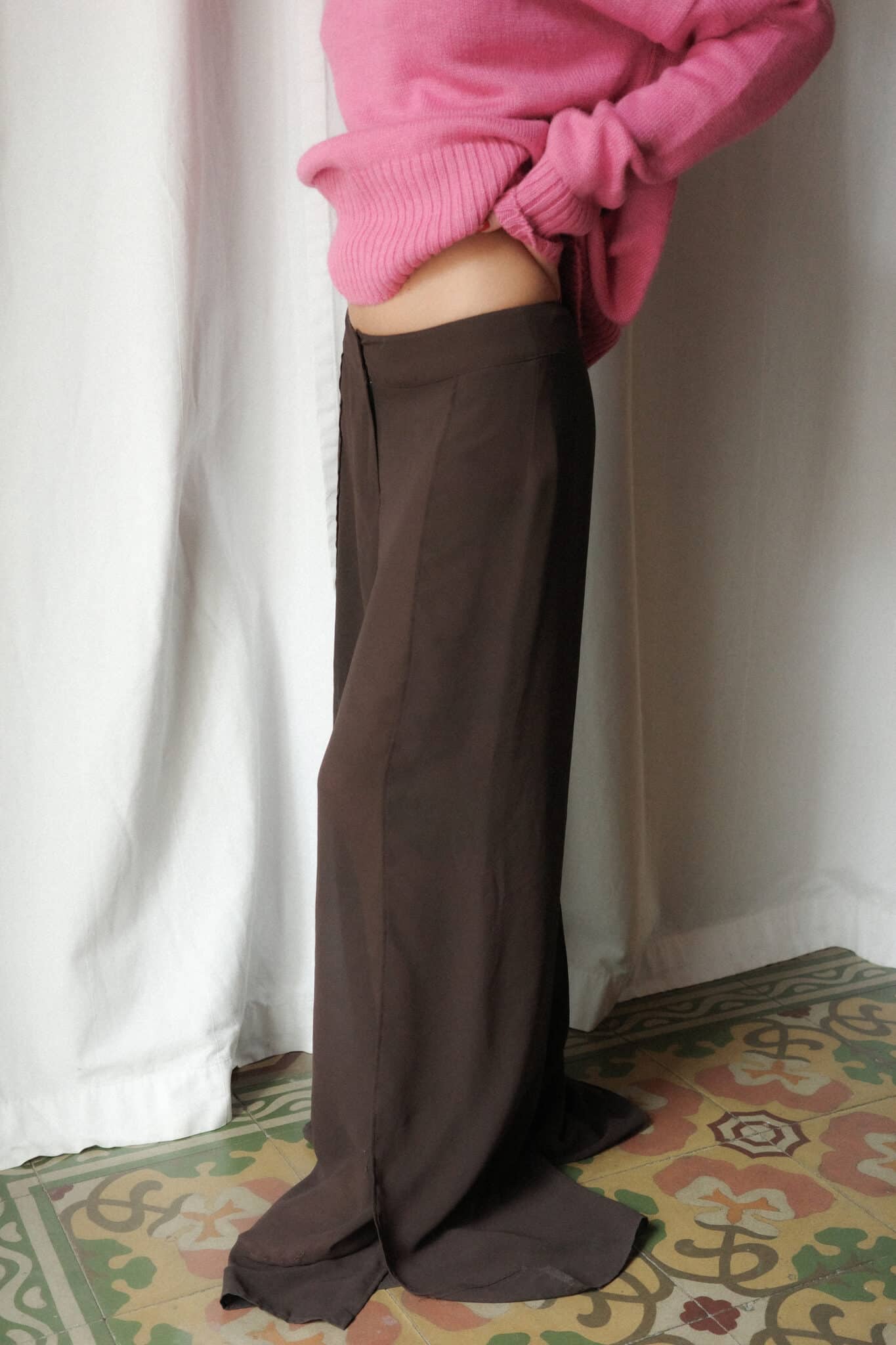 sheer wide leg trousers in a lightweight brown fabric with a fluid drape and clean waistband