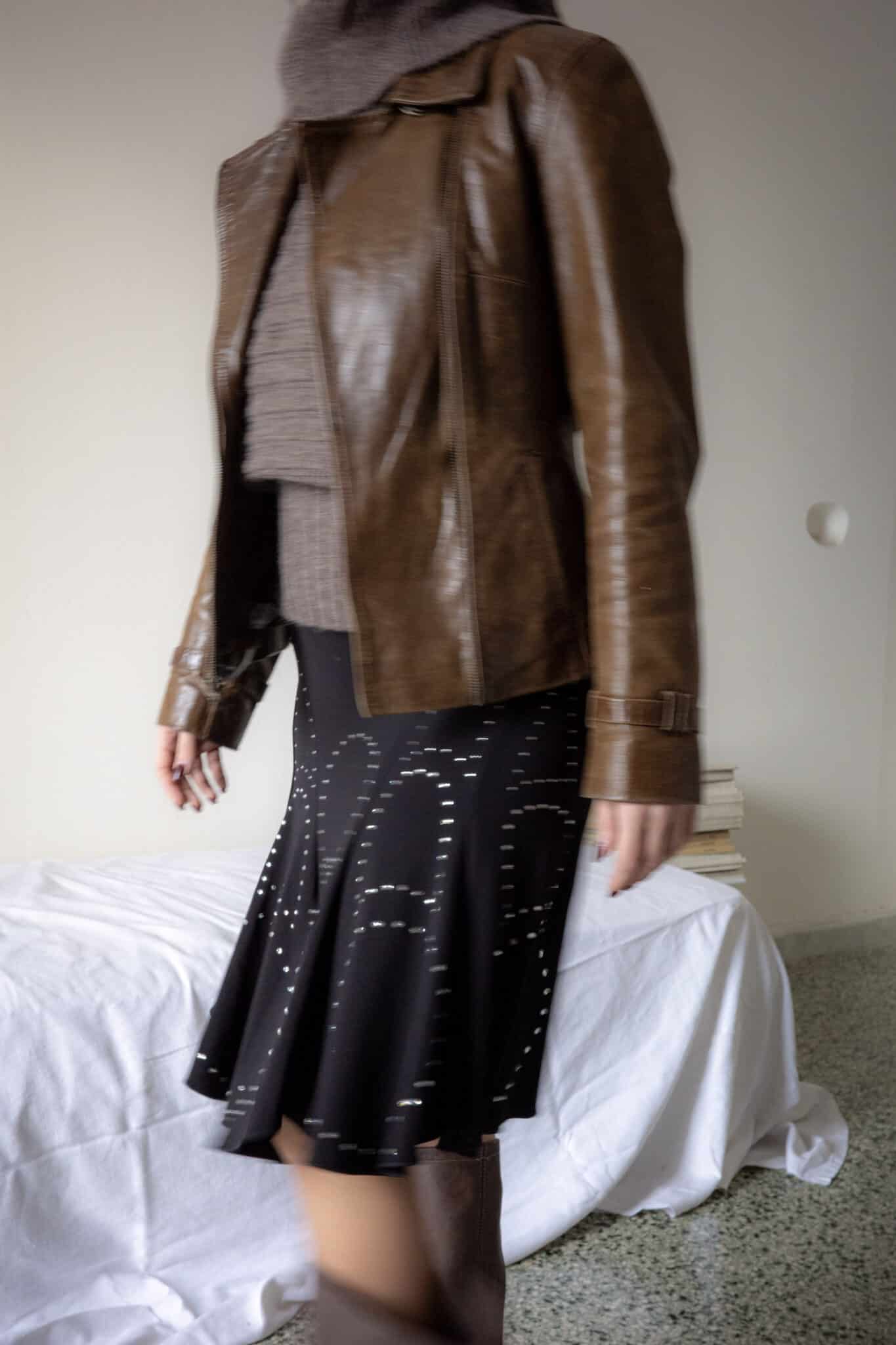 black midi dress with a deep V neckline at front and back, finished with subtle silver detailing and a softly flared hem