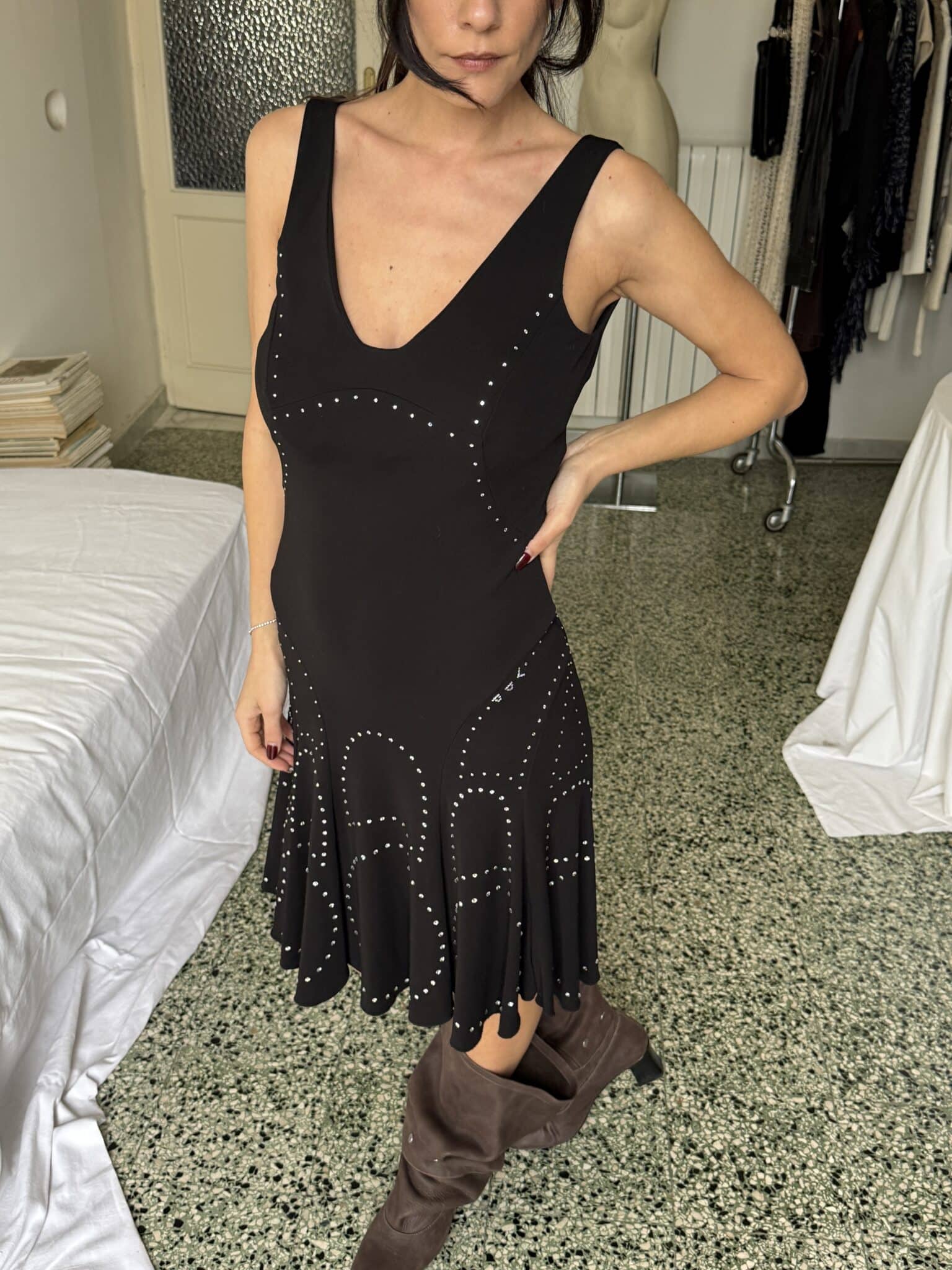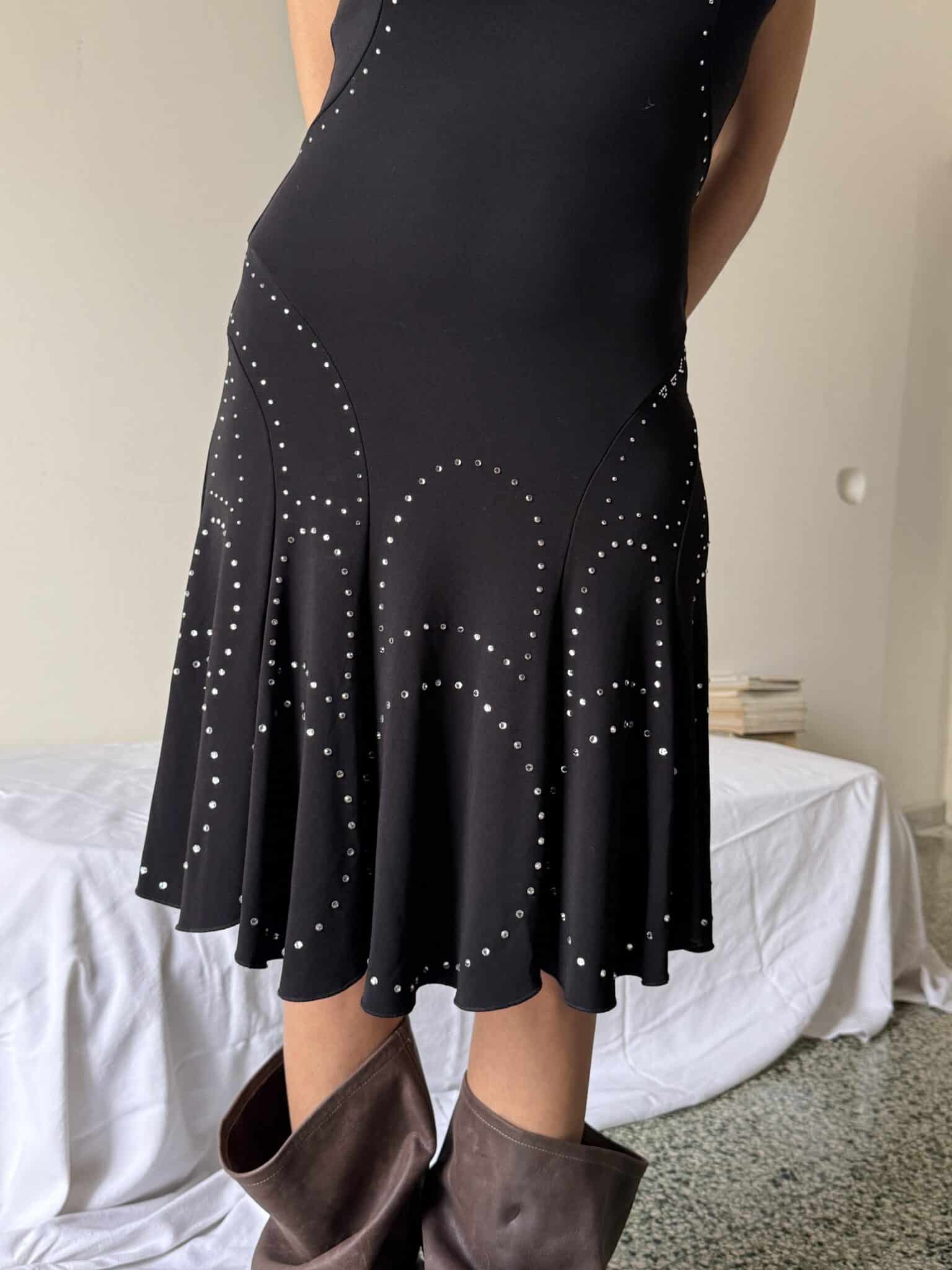 black midi dress with a deep V neckline at front and back, finished with subtle silver detailing and a softly flared hem