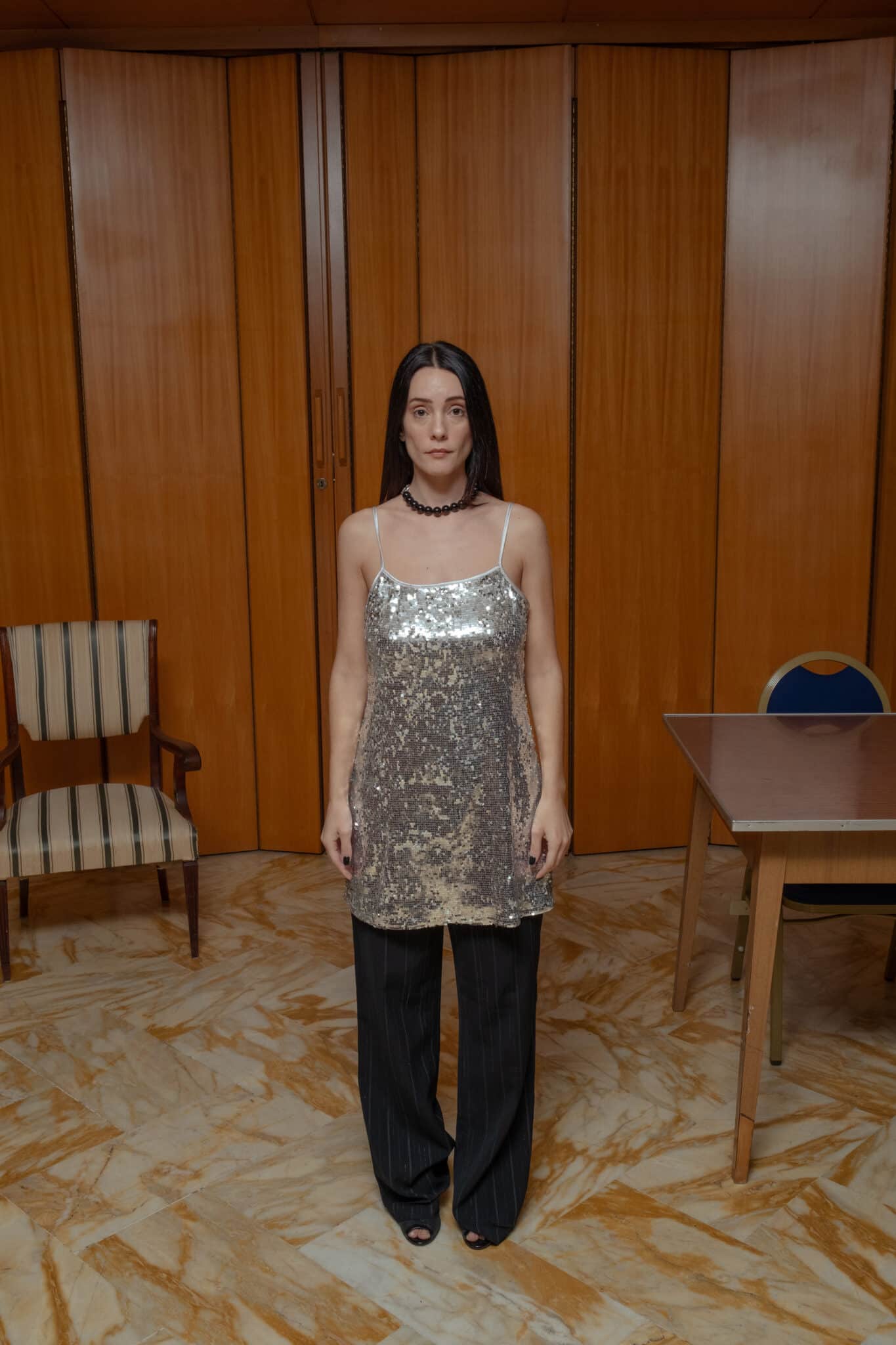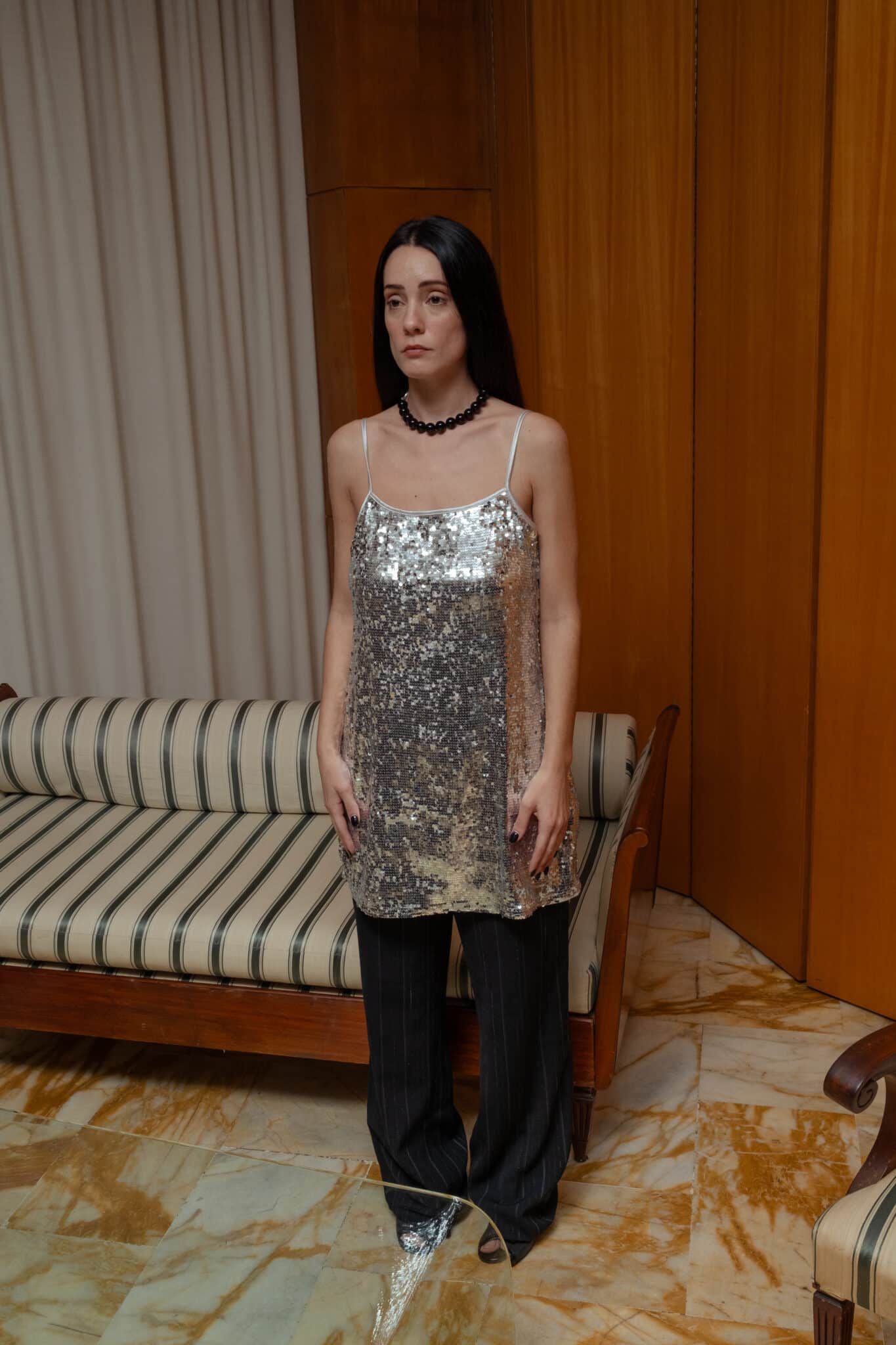 silver sequin camisole dress features a straight, relaxed fit with thin adjustable straps. the surface is fully covered in small sequins, creating an even reflective finish without added structure. the lightweight base allows the dress to be worn on its own or layered over trousers or skirts.