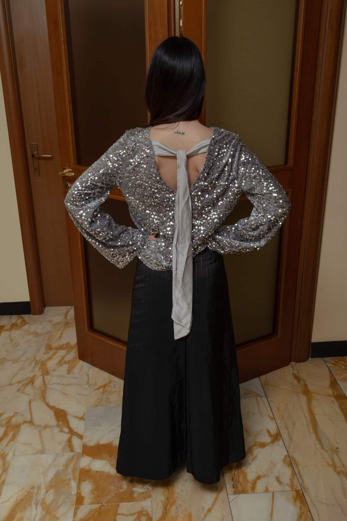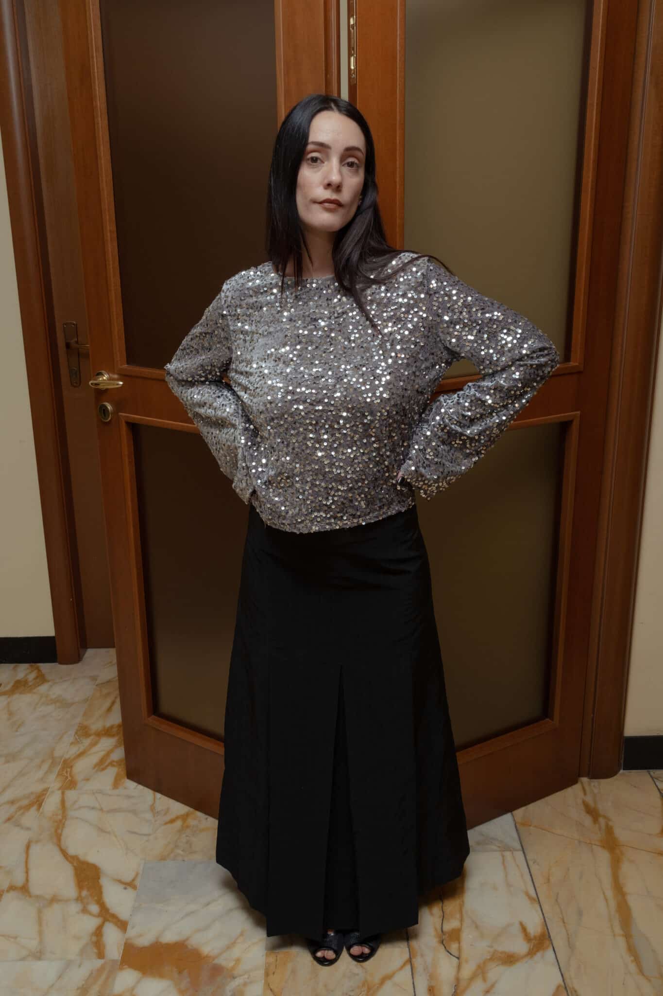 silver sequin long sleeve top covered in small sequins applied evenly across the surface. Designed with long sleeves and a straight, relaxed cut that allows ease of movement. The fabric has minimal stretch and sits lightly on the body.