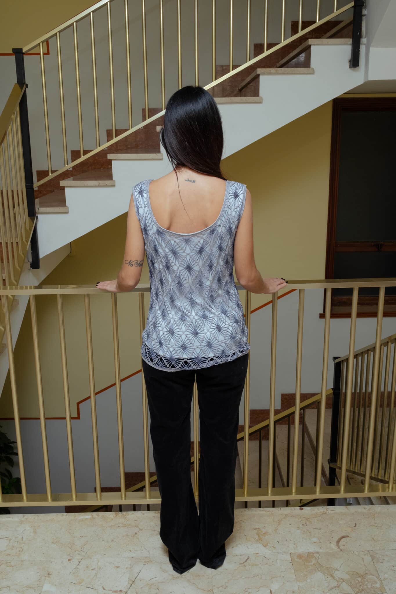 sleeveless embellished top with small applied stones arranged in a repeating geometric pattern. Cut with a round neckline and a straight, relaxed fit. Lightweight construction with subtle drape