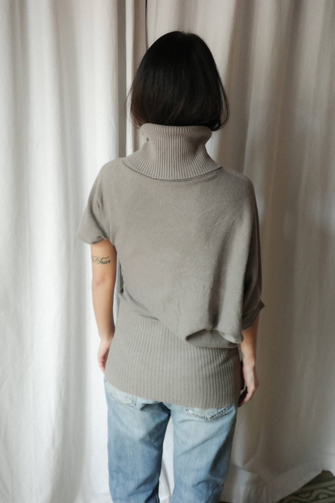 ribbed turtleneck top features a relaxed silhouette with a structured ribbed hem that defines the wait. three-quarter sleeves and a soft, fluid drape.