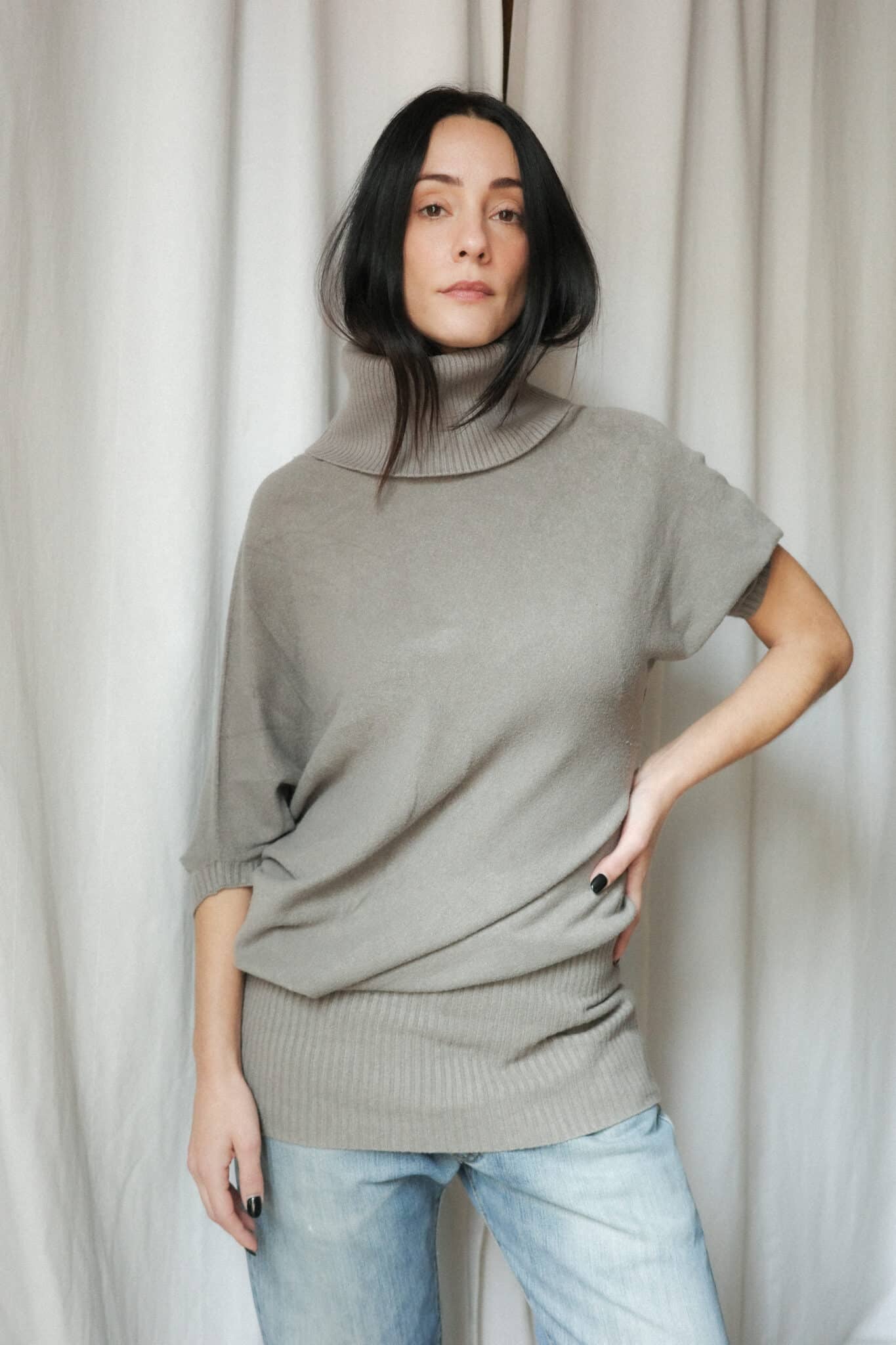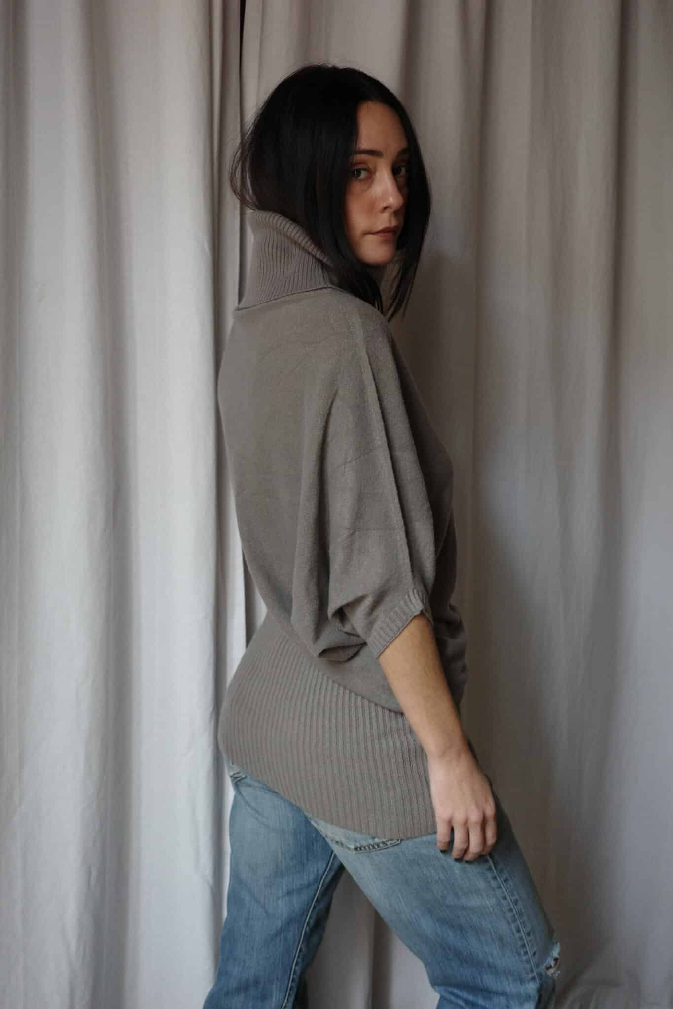 ribbed turtleneck top features a relaxed silhouette with a structured ribbed hem that defines the wait. three-quarter sleeves and a soft, fluid drape.